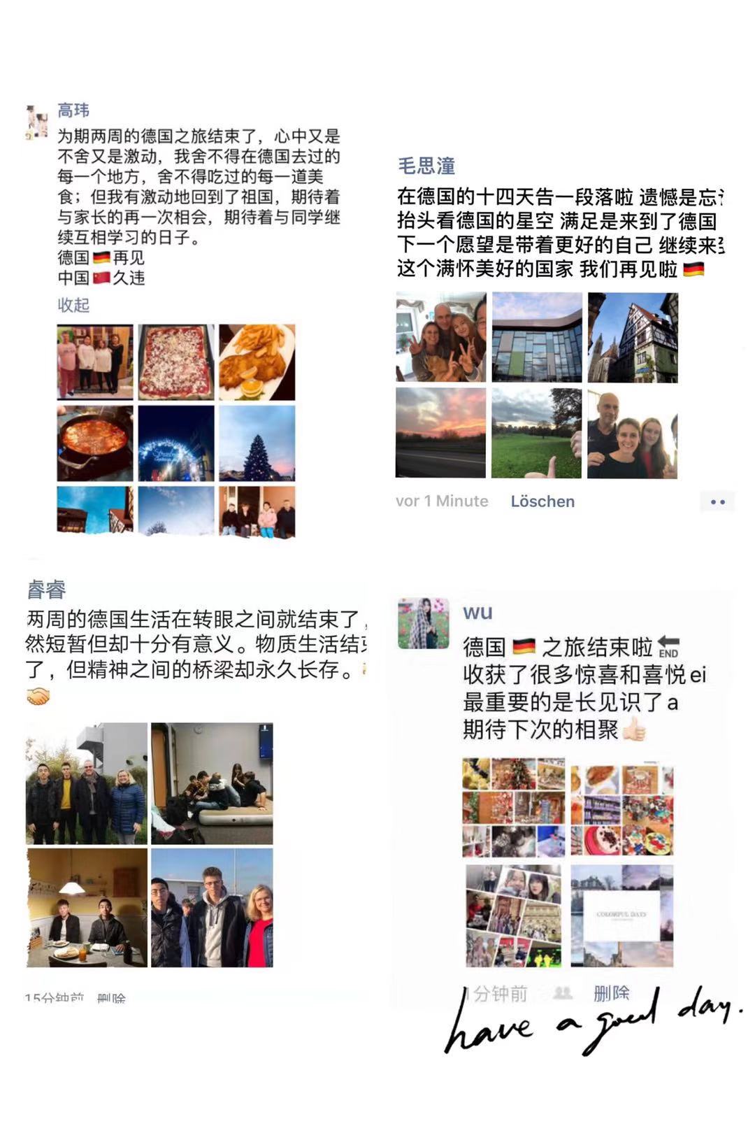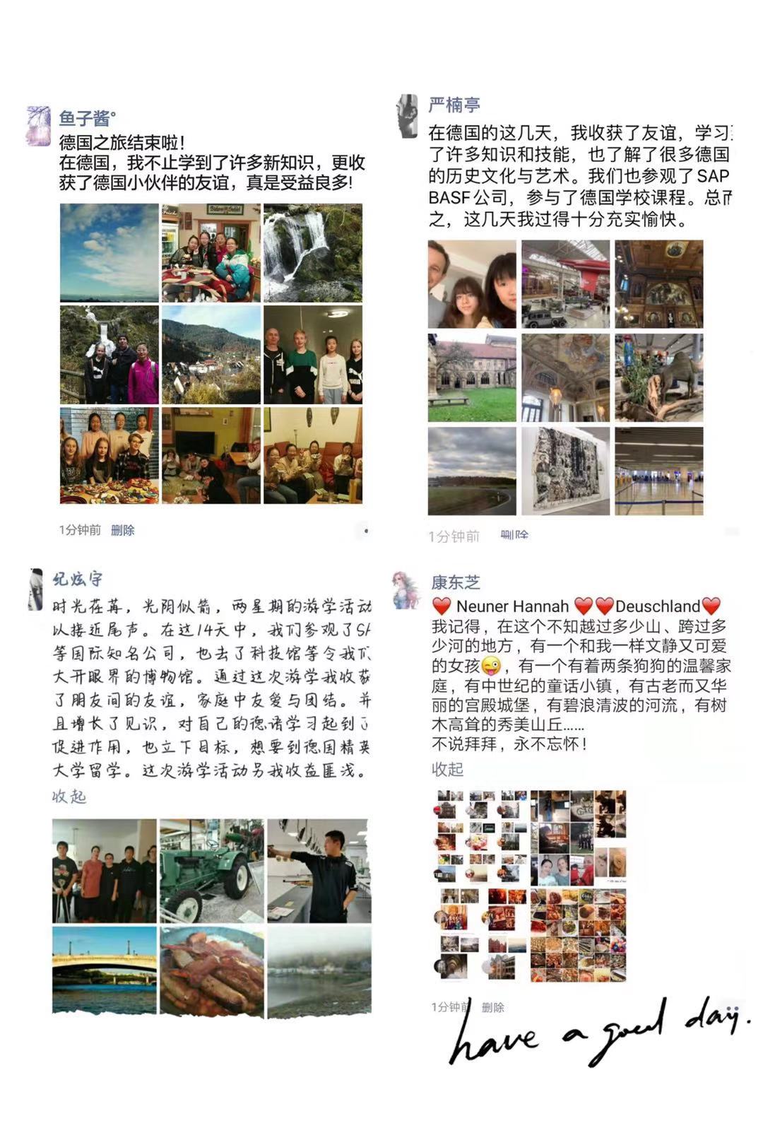 回顾两周的游学活动,同学们过得快乐、活力、充实,在同学们心中刻下深刻的回忆。即便相隔万里,相信友谊也将得以长存。希望两校的学生们能够努力学习语言文化、丰富视野,争当中德两国文化交流“小使者”,愿两校友谊之树常青,中德文化交流更放异彩。