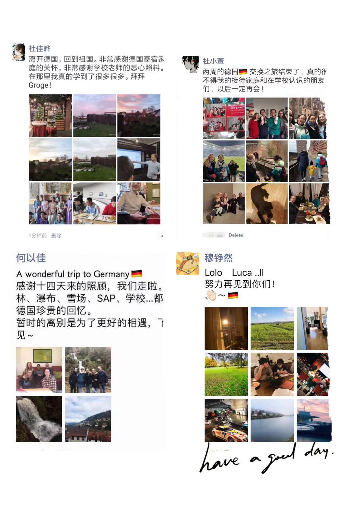 初二(4)班何以佳:十四天的德国之旅转瞬即逝,回想起出发时的激动与兴奋,此刻的不舍越发清晰。忆起这两周,我与接待家庭一起做了圣诞饼干,去黑森林游玩,学习了德国的传统民俗,品尝了各种各样的美食。德国父母每天真挚的问候和细心周到的照顾;Helen和Linda温暖的关怀和轻松愉快的姐妹情;陌生店员带着微笑的耐心服务;他乡华人同胞几句亲切的中文;潘老师每日暖心的关心和帮助;同学们之间更进一步的情谊…这一切都使得此次游学温暖快乐而充实,也让我对德国越发喜爱。这次游学使未来在德国学习工作的愿望在我心中生根发芽,但愿几年后我能有资格回来看望他们。德国,再会!
