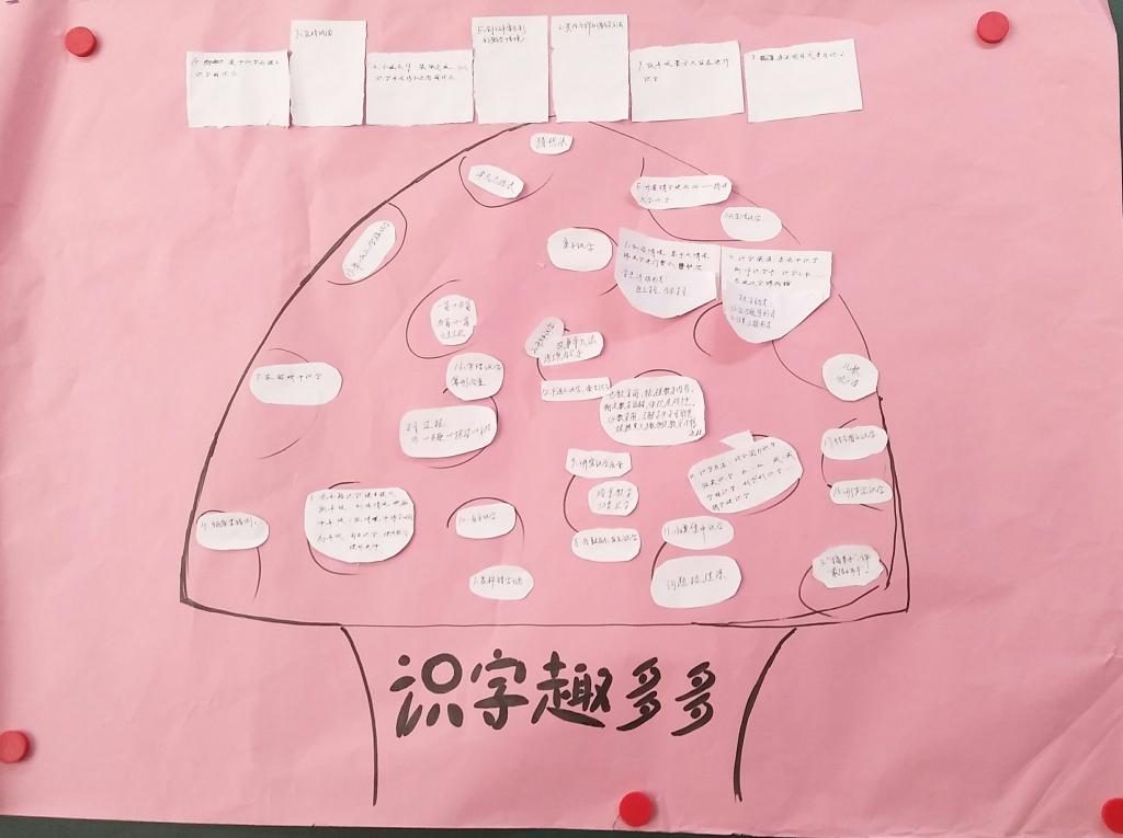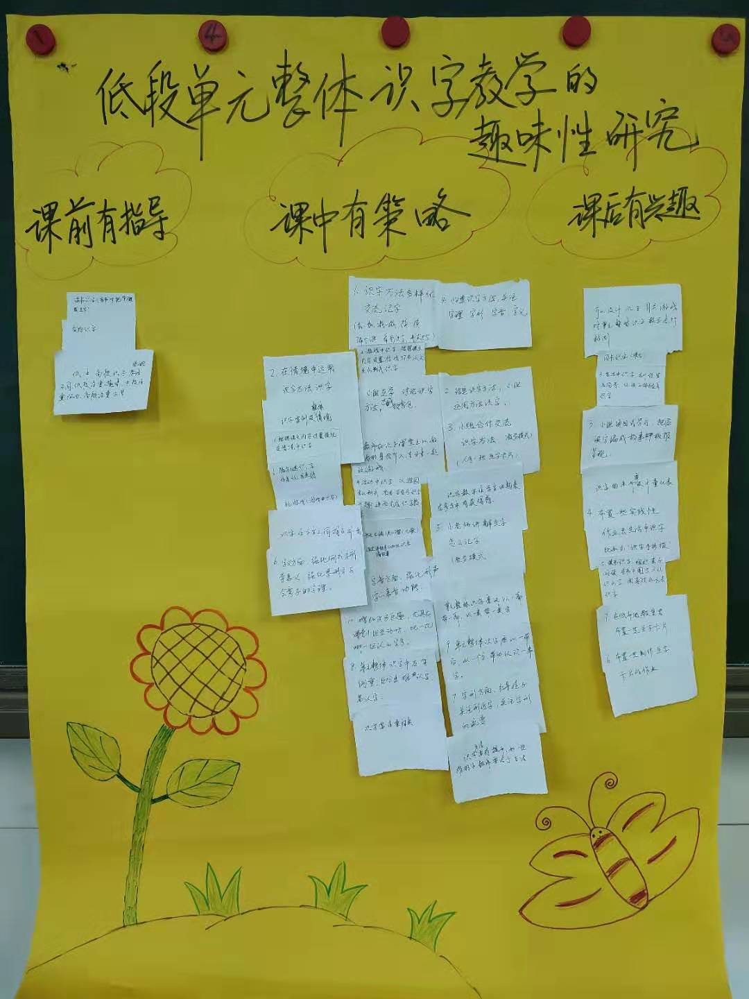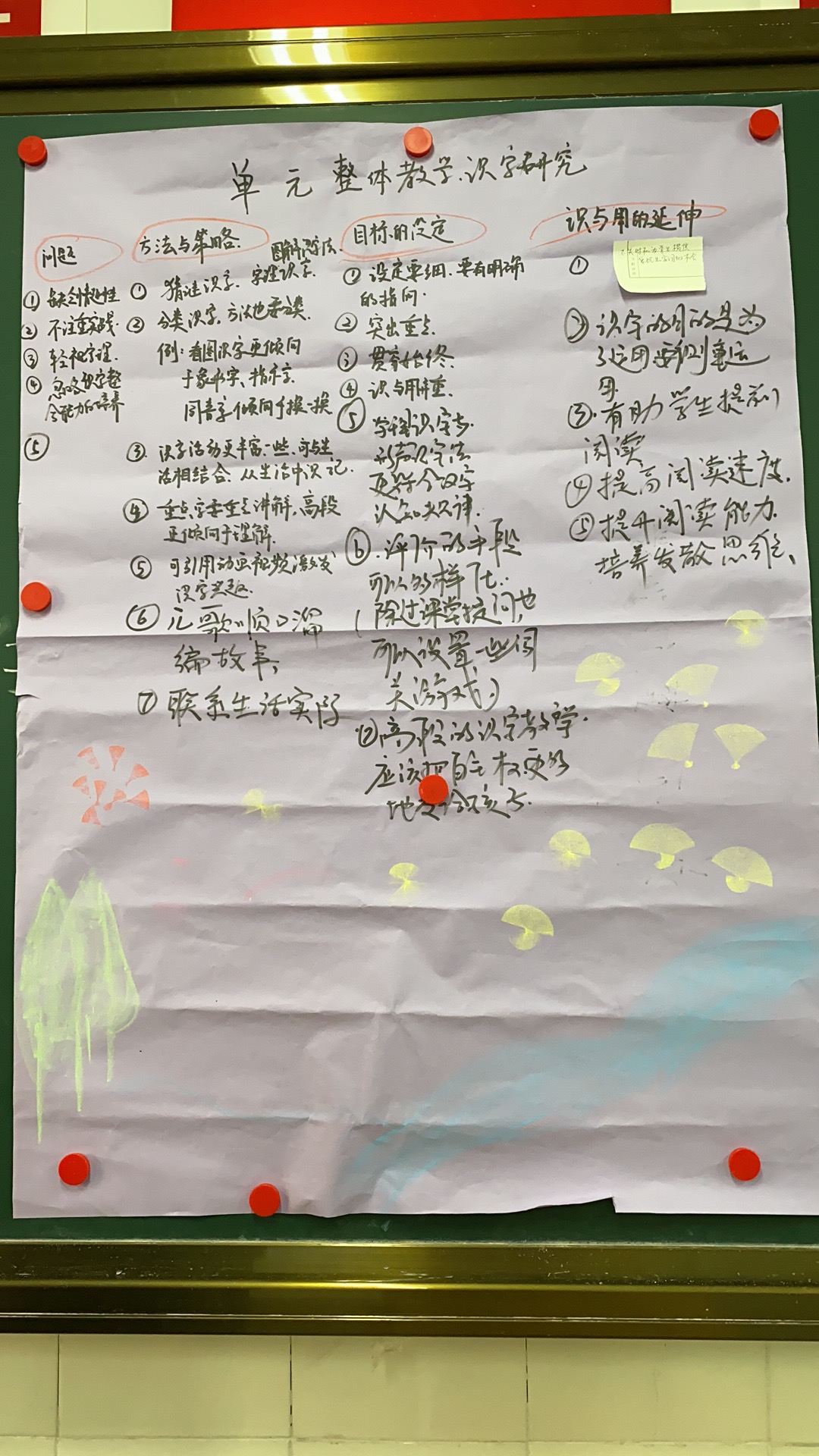 最后,语文教研组长张月华老师也对本次活动进行了总结,首先肯定韩老师的授课效果。同时在语文组内,针对不同年段的语文学习特点,借鉴行动学习的理论采用团队共创的活动形式来开展单元整体识字的方法或策略研究的头脑风暴。各个年级的老师们,群策群力,积极思考关于识字教学的方法与策略,精心绘制关于单元整体识字的思维导图,随后各小组展开了精彩的分享。相信在此次教研活动中,每一位老师都有自己的收获与思考,同时也为单元整体教学研究工作积蓄前行的力量!