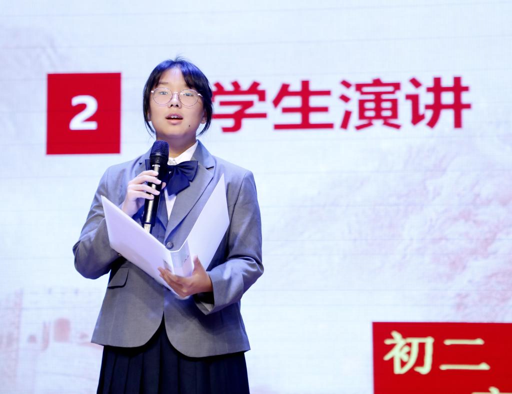 随后,高泽诺同学发表了题为“峥嵘一二九 奋进新时代”的主题演讲,她用激情澎湃的语言,将八十四年前青年学生的壮举与新时代的青年学生应有的表现相联系,发出了“踏着先辈们的足迹,按照十九大描绘的美好蓝图,扬帆再起航,奋进新时代”的倡议,希望所有中学生努力把对先烈的敬仰和思念化做实际行动,在学习中,汲峭攀登;在生活中,积极奋进;在社会上,恪守道德法制。