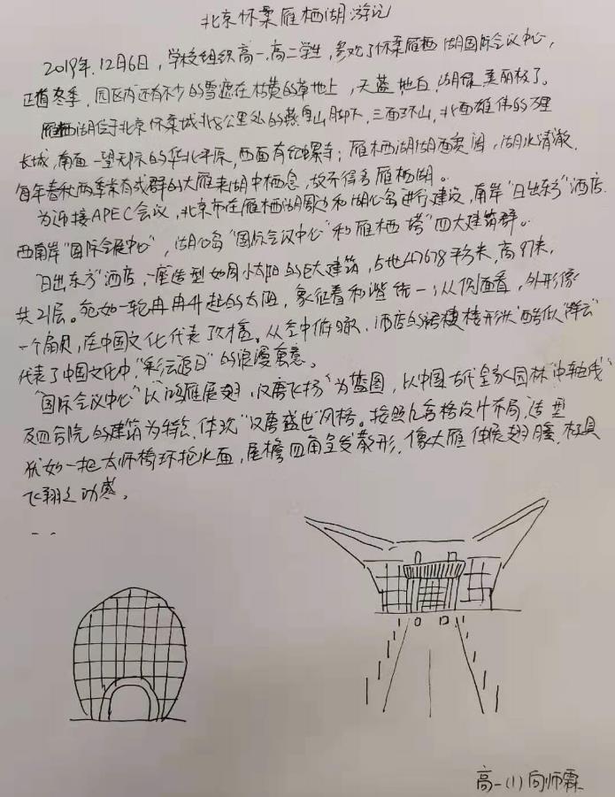 @高一(1)班 刘静怡:晴朗的冬日里,我们踏入庄严宏伟的展示中心及会议大厅,看到巨大的圆桌、席位座位,水晶吊灯,倍感祖国厚重实力、财力之强和国际地位之高。走在景区的道路上,观赏精致的建筑,山体石头块之间记录着历史痕迹的展板在冬日的阳光下熠熠生辉,我们内心充满了自豪与骄傲,并下定决心为了祖国更好的未来而努力。