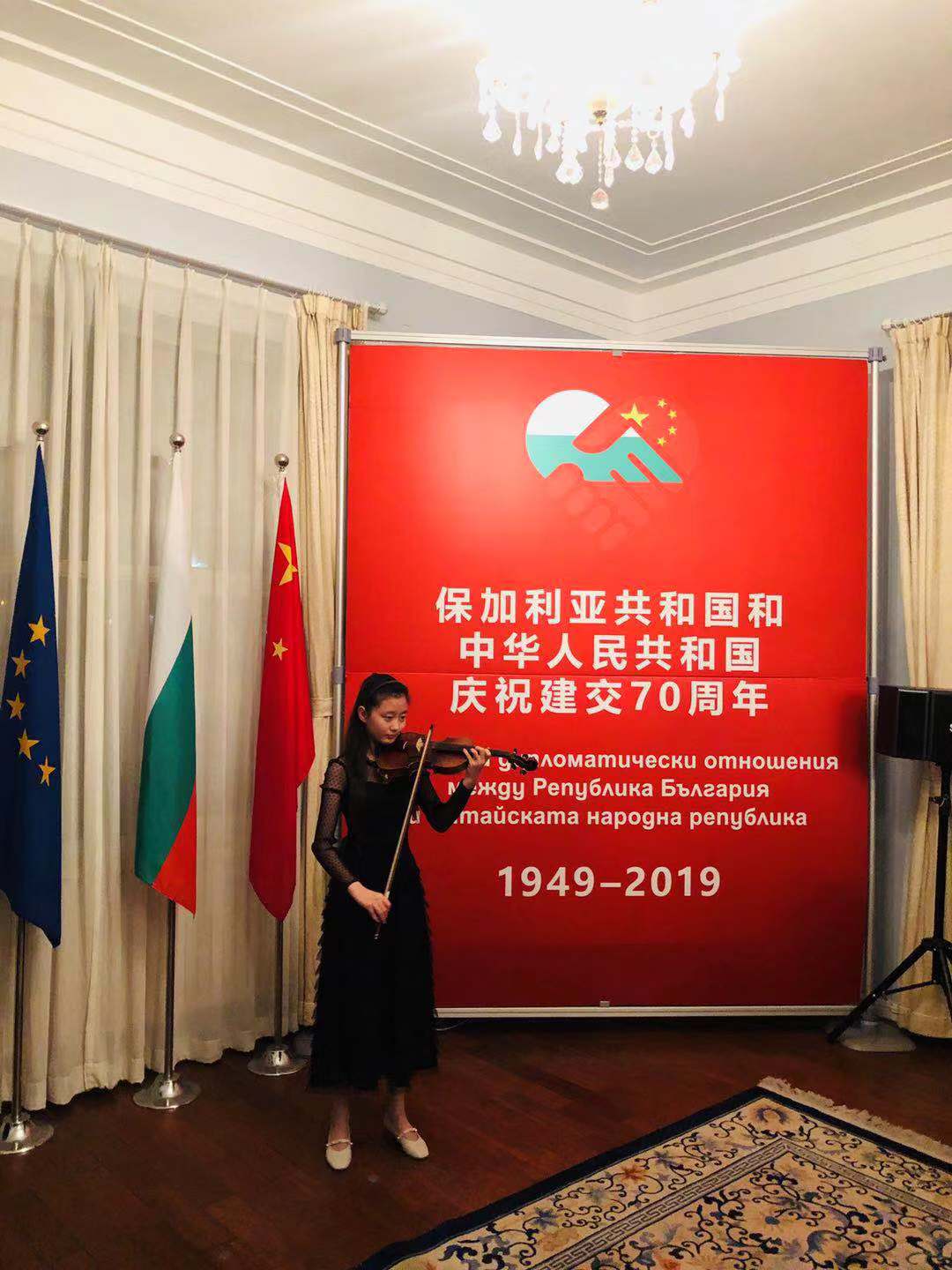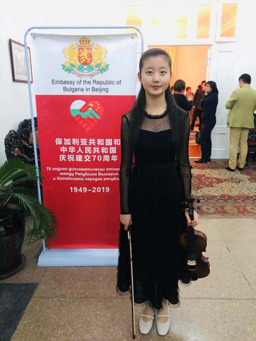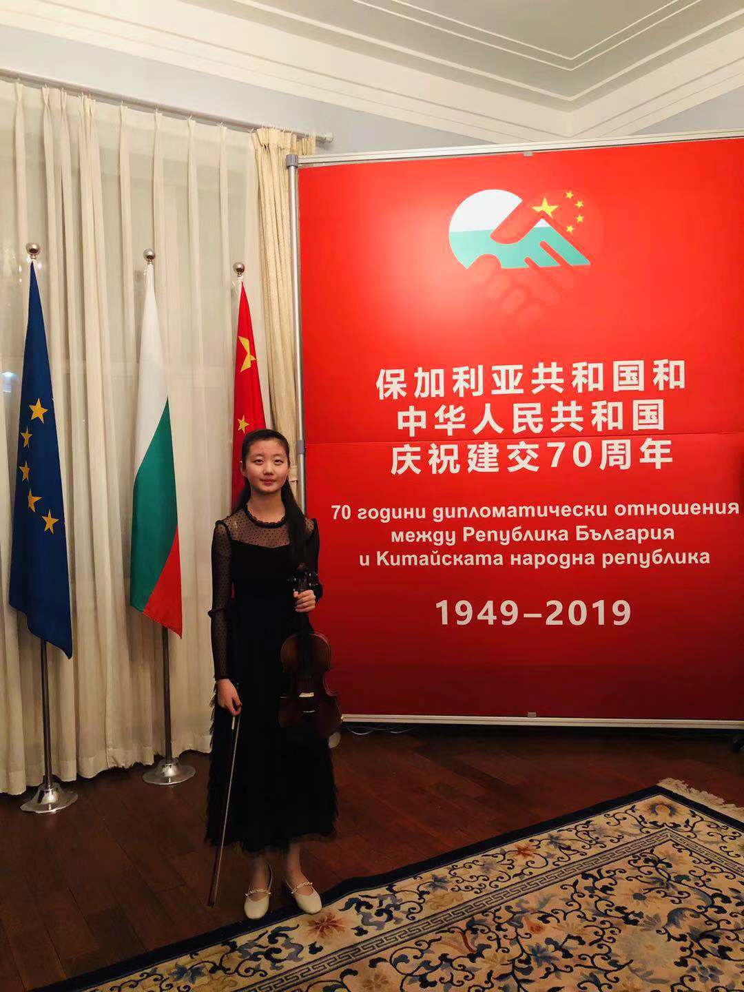 今年是新中国成立70周年,同时也是中国和保加利亚建立外交关系70周年。2019年12月18日,保加利亚驻华使馆举行了新书《玫瑰之国—保加利亚》首发式暨中保建交纪念活动。我校初二(4)班于子涵同学作为唯一一位中国学生代表受邀参加此次活动,并作为表演嘉宾演奏小提琴曲目。保加利亚驻华特命全权大使格里戈尔·波罗扎诺夫先生出席此次活动并致辞。活动由保加利亚驻华使馆教育文化处官员玛利亚·伊瓦诺娃主持。