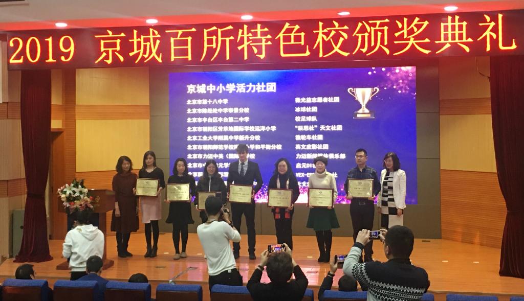 12月22日,“2019年京城百所特色校颁奖典礼”在首都师范大学国际文化大厦报告厅隆重举行。我校获得京城教改创新领军学校奖,我校的天文社团也获得优质社团奖。我校副校长高雁鸣代表学校出席颁奖典礼并领奖,我校天文爱好者社团负责人徐江妮代表社团领奖。