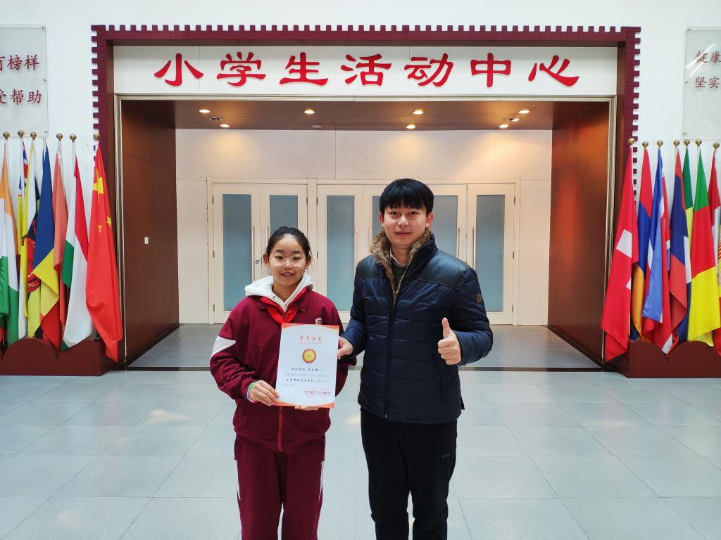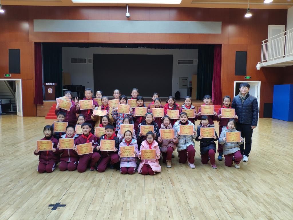 讲话结束后,大队辅导员席老师宣布获奖师生名单。12月14、15日,由杭小萌老师带队,我校10名同学参加了2019年海淀区中小学生羽毛球比赛,并取得了可喜的成绩,较往年有所突破。我校六(7)班张永慧同学取得小学甲组女子单打第3名的好成绩。此外,我校陈泓嘉、侯云熙、庄严淇等同学在小学生课题研究开题报告活动中获奖。小学副校长孙亚楠为获奖师生颁奖。