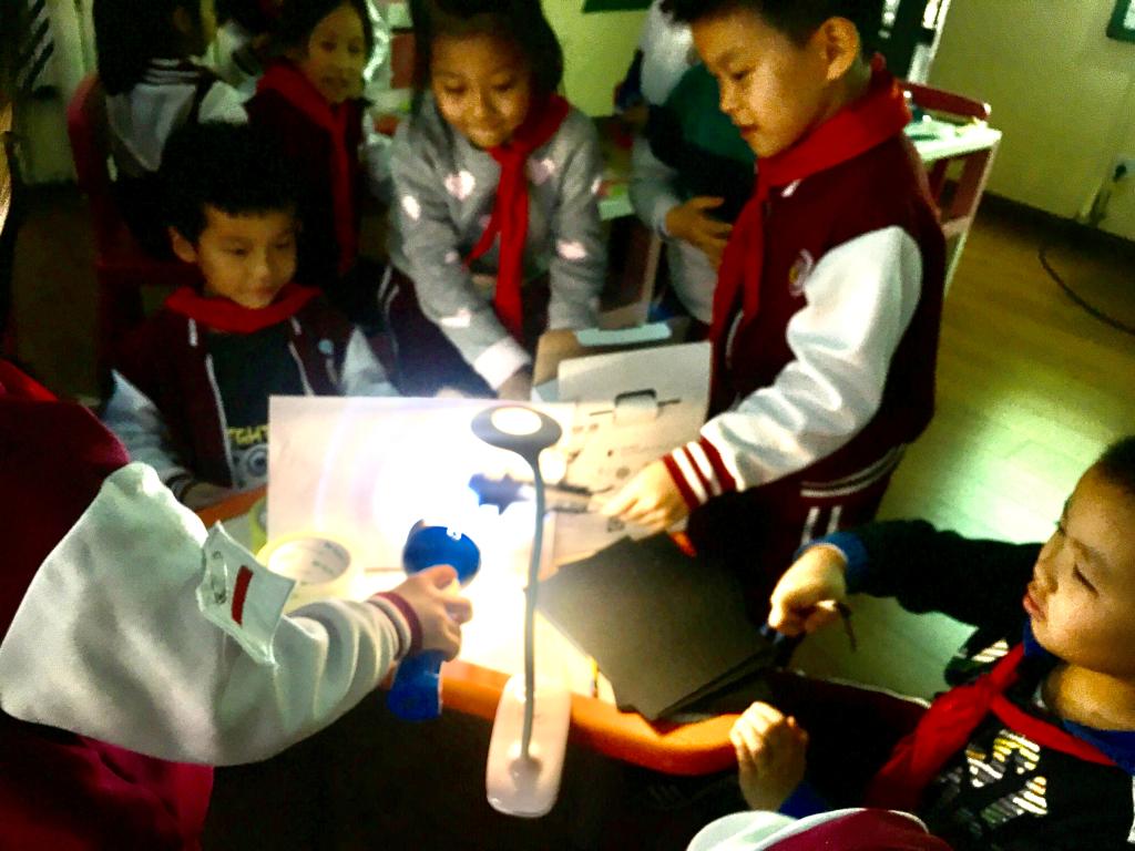 在皮影的制作环节,Robert给学生们口述了如何用卡纸和木棍制作皮影,播放了通过光的变换制造不同的阴影来表演皮影戏的短片,并展示了多种多样的皮影人物设计。孩子们以非凡的想象力和创造力制作出了美观多样的皮影人物。课程最精彩的环节莫过于皮影戏表演——孩子们在准备好的幕布后不停变换摆弄手电筒,用英文演绎了一出出活泼丰富、精彩纷呈的皮影戏。其中一个小组表演了关于“波音777”飞机坠机的故事,另一个小组演绎了一个勇敢的小女孩穿越丛林的故事,都令人印象深刻。