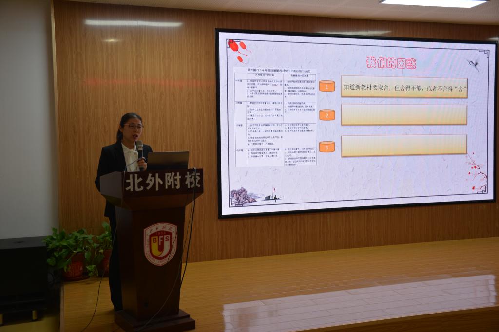 其中,张月华老师代表我校小学语文教研组围绕“聚焦语文要素,实现深度学习”这一主题发言,分享了我校基于统编版教材阅读教学的经验。张月华基于统编版教材特点及我校语文教师的困惑,重点交流了我校阅读教学的探索过程及成果。通过任务驱动、设计问题、改革模式三方面的变革,鼓励学生主动地参与,经历问题的解决、知识的建构,进行深度学习的探索和实践是我们课堂改革的主要表现。张月华结合课堂教学案例,介绍了我校语文组聚焦语用基础、创设任务情境、聚焦真实体验、设计学习情境的策略和方法。我校以海淀区“十三五”课题为抓手,深入开展课例研究活动,由单篇阅读向多篇阅读即群文阅读乃至整本书阅读拓展,由课内阅读向课外阅读延伸。本周开展的“悦”读嘉年华活动,就是本学期整本书阅读成果的集中展示。