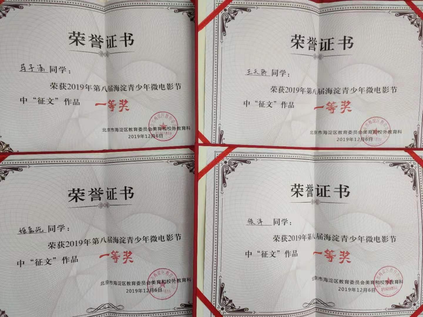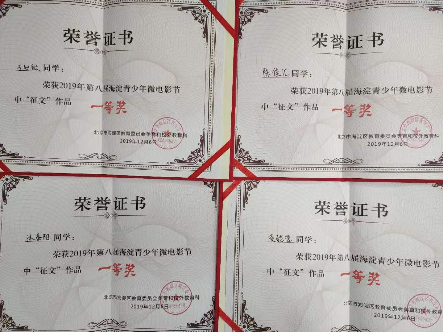 在第八届海淀青少年微电影节“征文”活动中,于知微、陈佳汇、马子涵、沐泰阳等10名同学荣获一等奖,姜彦竹、张跃瀚、王若煦、孙东宇等16名同学荣获二等奖。李镕泽、穆子康、周昊辰、杨怡铨等28名同学荣获三等奖。李琳、杨寒雨、李秋实、万响四名老师荣获优秀指导教师奖,北外附校荣获优秀组织奖。
