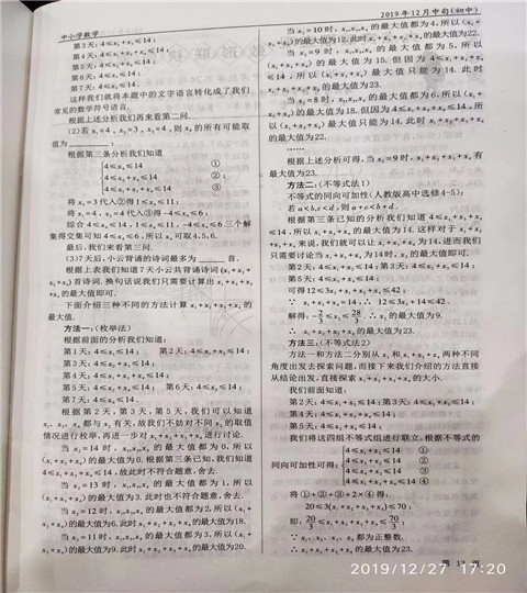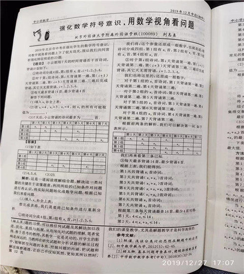 近日,我校初三数学教师刘志鑫《强化数学符号意识,用数学视角看问题》的论文刊登于中国教育学会主办的杂志《中小学数学》(2019.12刊)“解题研究”板块中。该论文以2019年北京中考23题“小云背诗”为背景,以数学建模为载体,站在学生思维多角度分析此题的解法。