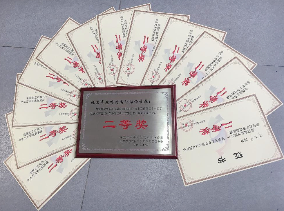 为弘扬传统文化、增强学生对京剧艺术的喜爱、深化素质教育成果,我校于2018年成立京剧团,经过近2年的努力,共排练剧目10余个,各类型演出10余场,2018年9月京剧团获海淀区青少年艺术节戏剧类二等奖。京剧团的建设离不开师生的辛勤排练,更离不开家长和社会各界的帮扶。期待我校京剧团更多精彩表现!