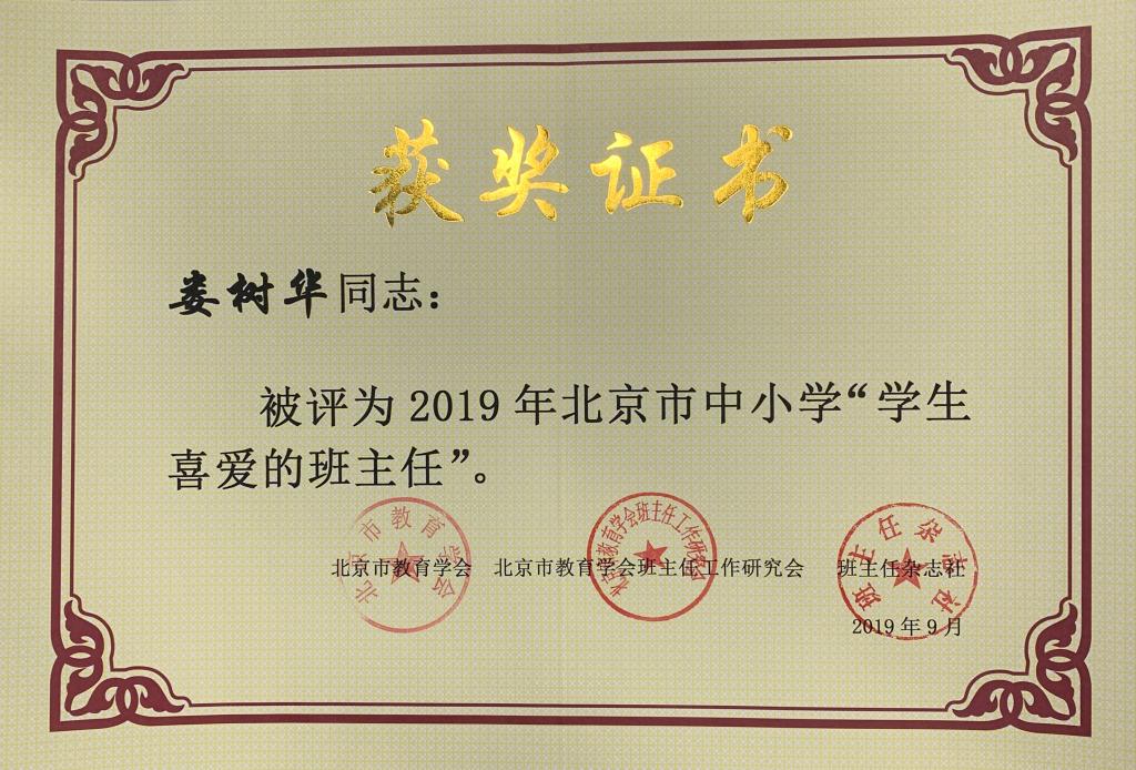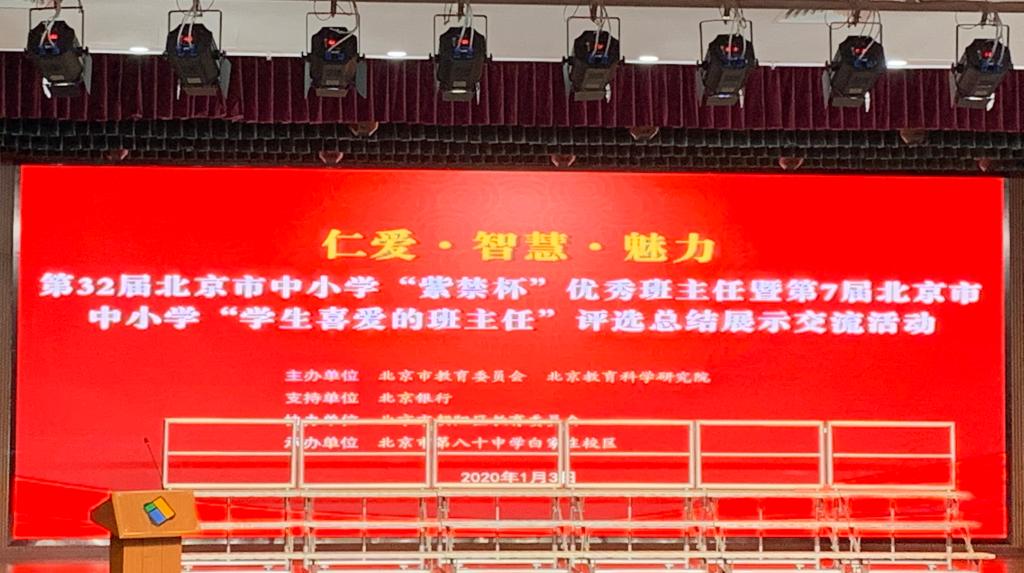 1月3日,第32届北京市中小学“紫禁杯”优秀班主任暨第7届北京市中小学“学生喜爱的班主任”评选总结展示交流活动在北京市第八十中学举行。我校推荐参选的高中班主任娄树华老师荣获第7届北京市中小学“学生喜爱的班主任”荣誉称号。