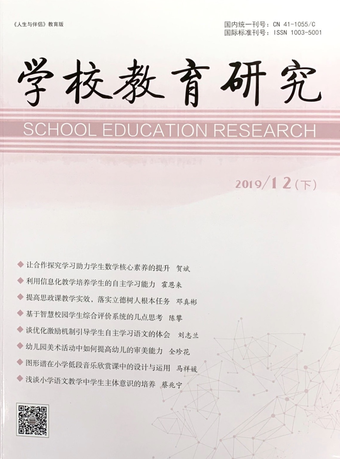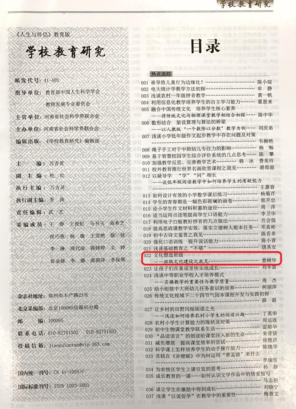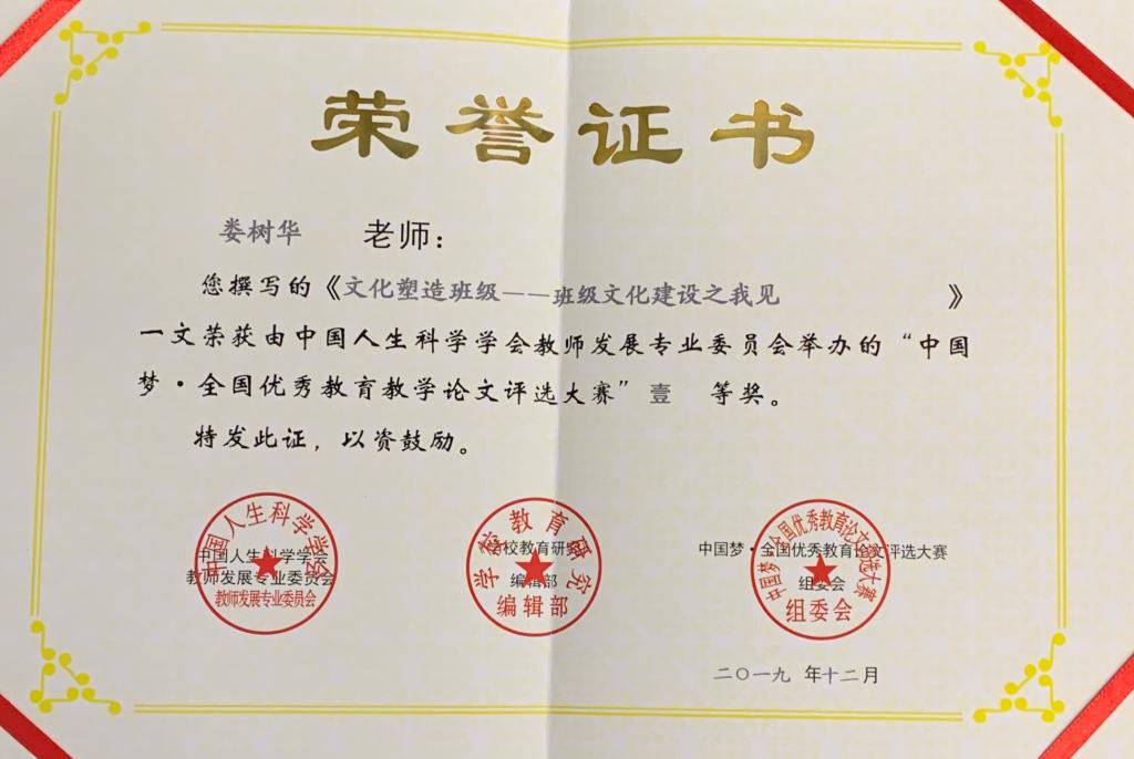 此外,娄树华老师撰写的《文化塑造班级——班级文化建设之我见》一文荣获由中国人生科学学会教师发展专业委员会举办的“中国梦·全国优秀教育教学论文评选大赛”一等奖,并发表于国家级刊物《学校教育研究》2019年第12期。
