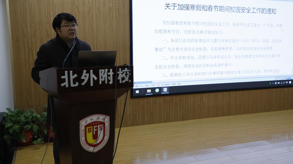 杨磊传达了近期海淀区教委、北京外国语大学对寒假期间校园安全工作的通知和要求,详细解读了海淀区教育系统2020年元旦春节烟花爆竹安全管理工作方案》和《北京外国语大学关于做好寒假期间校园防火工作及禁放烟花爆竹的通知》,并对寒假值班及安全工作进行了具体细致的布置,强调了《北外附校关于加强寒假和春节期间校园安全工作的通知》。