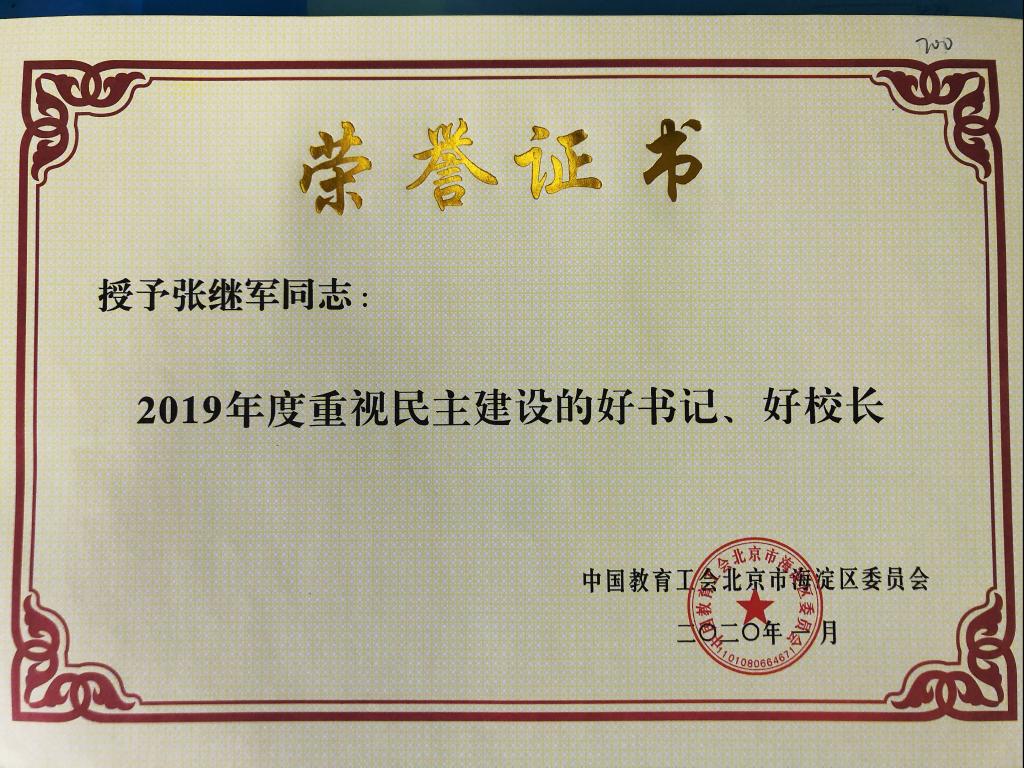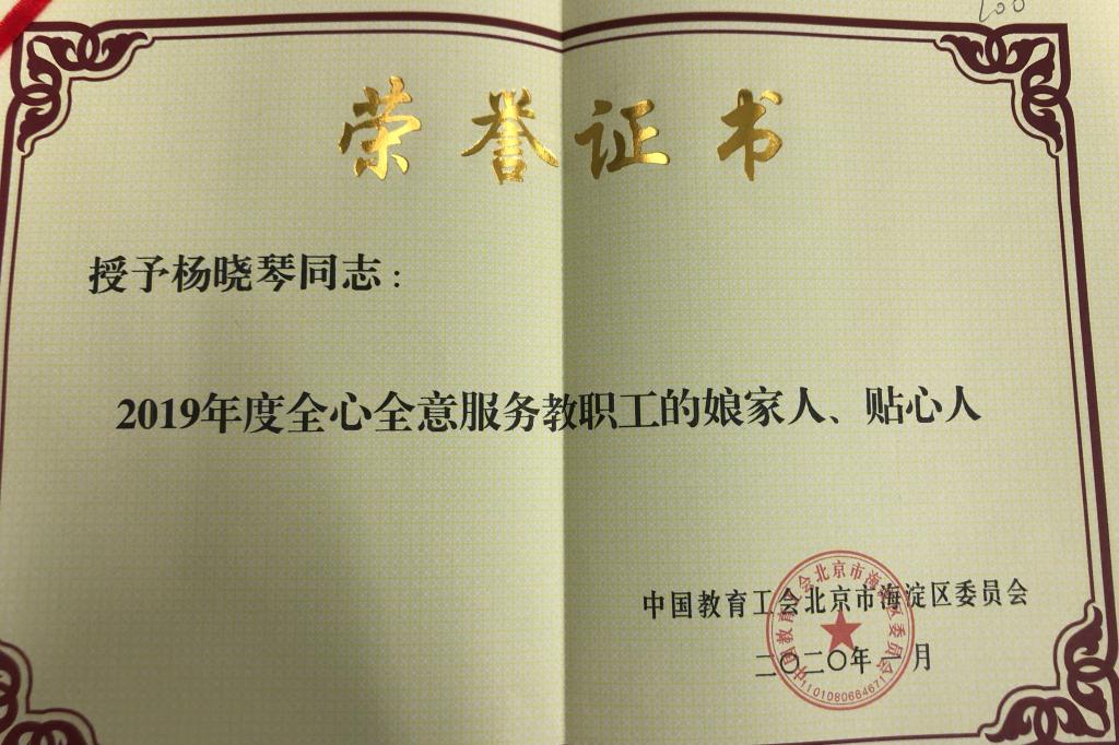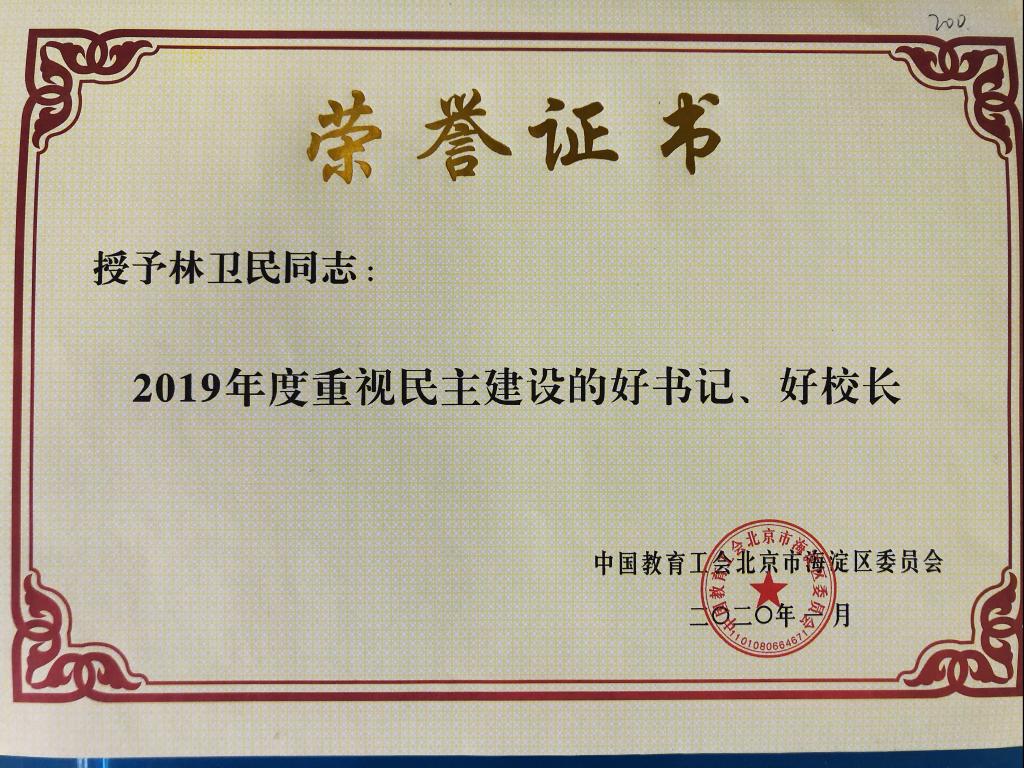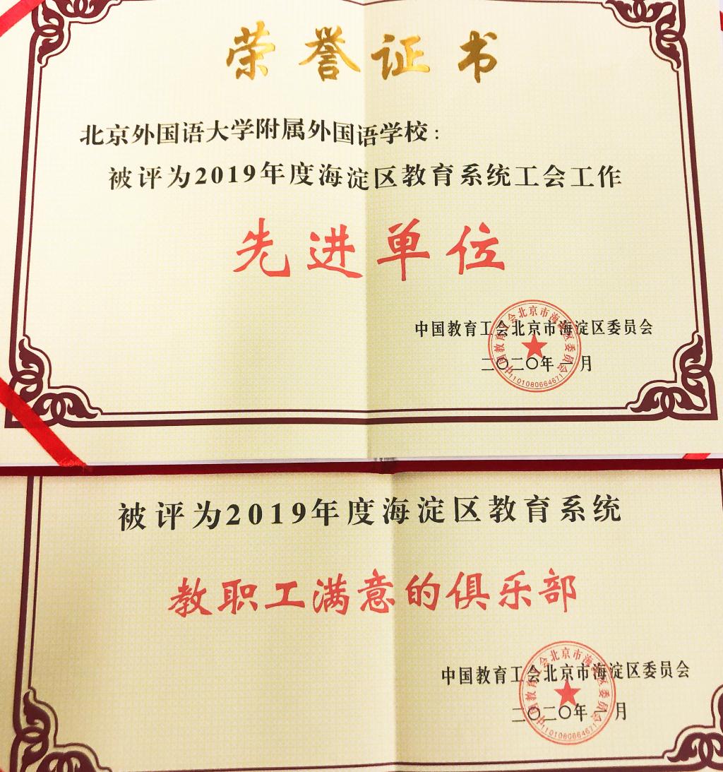 学校荣获 “2019年度海淀区教育系统工会工作先进单位”, 高中校区、初二年级部、小学英语教研组等三个工会小组被评为2019年海淀区“职工小家” 达标单位。