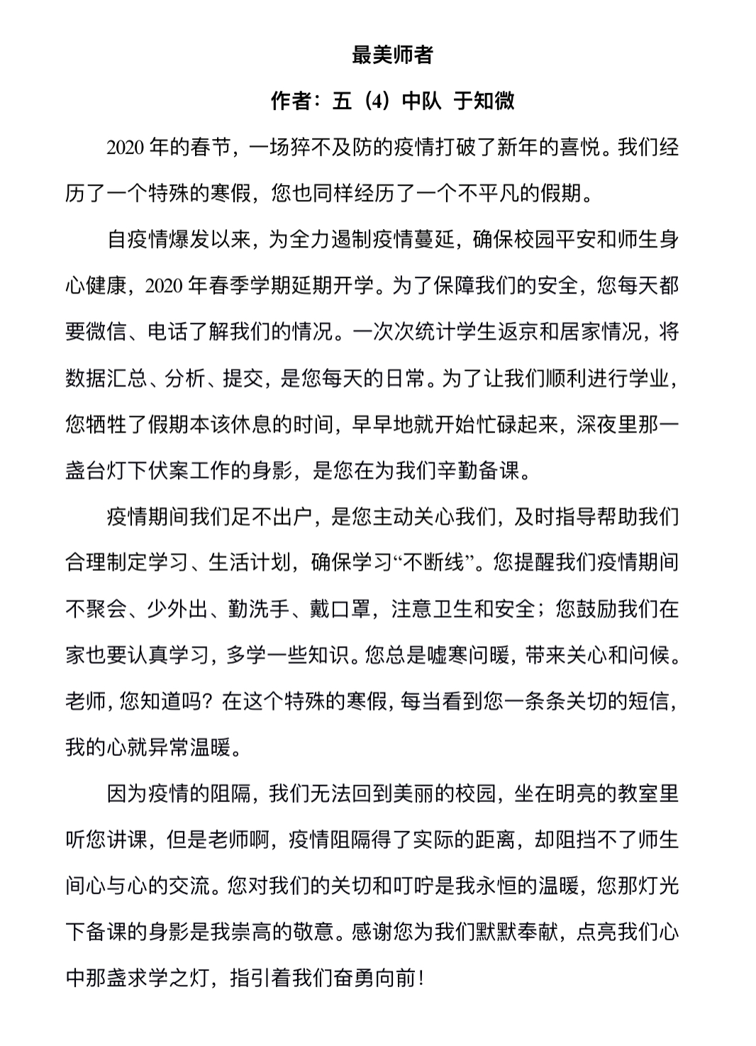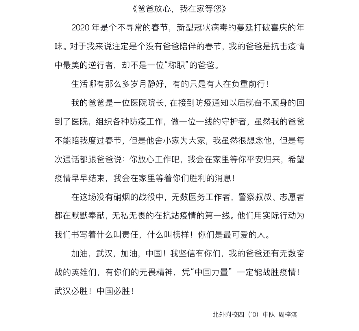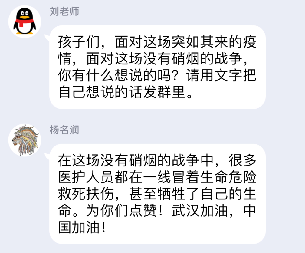 亲爱的队员们,正如升旗仪式中所说:国难当前,疫情期间,每个人都应该拿出自己的担当。而你们的担当应该是:珍惜时间,努力学习,强身健体,时刻准备着,为建设祖国、为保卫人民储备知识、积蓄力量。冬将尽,春可期,当我与你在学校再相见,发现:归来时,你已成长。