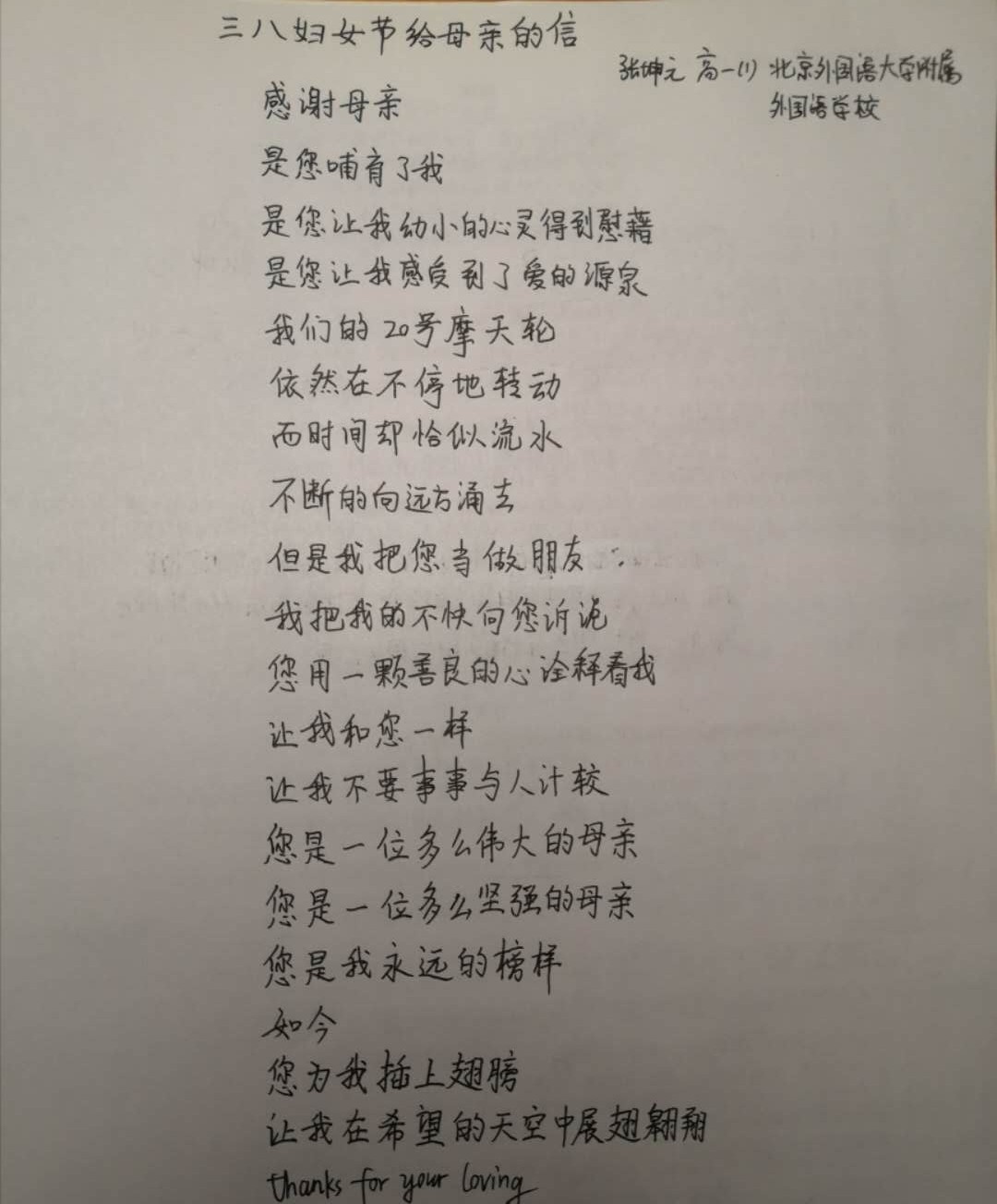 @高一(1)班 向师霖:“母亲啊,您就是辛勤而智慧的鸟儿,让我为您献上最鲜艳的花。”