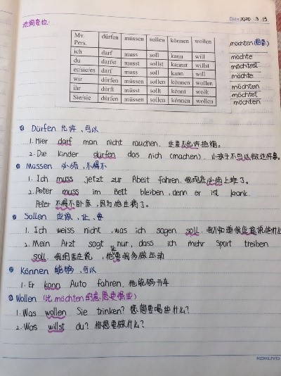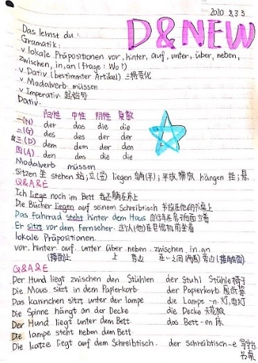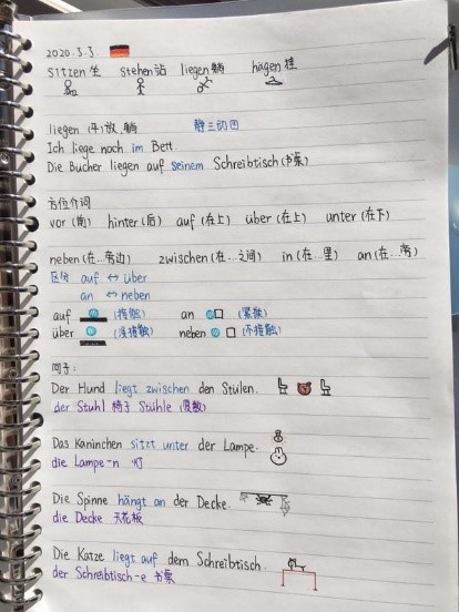 在德语学习笔记中,学生们用不同颜色的笔标注重难点,用图文并茂的方法增加易趣。