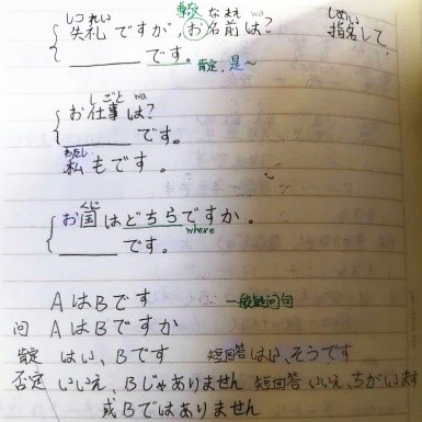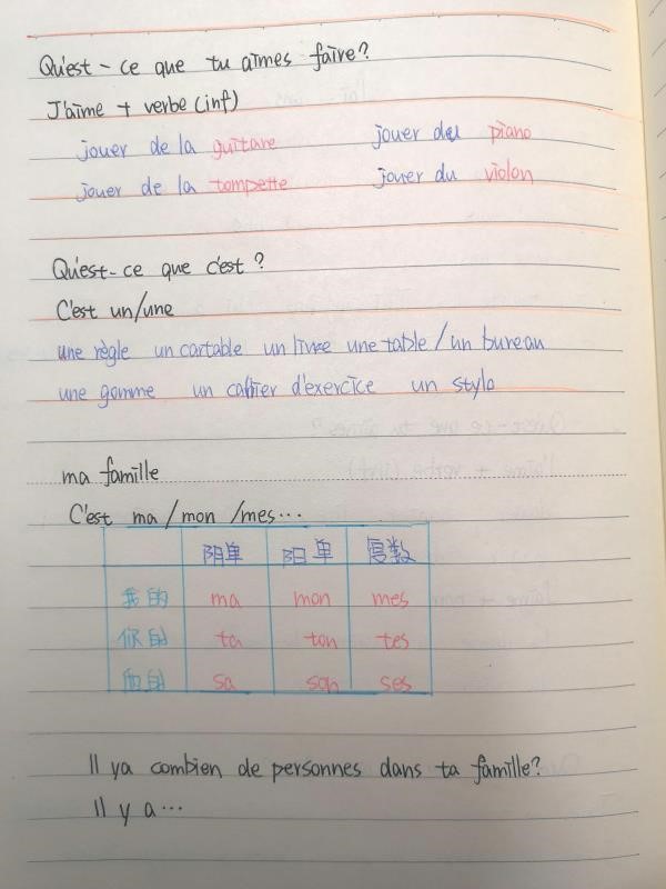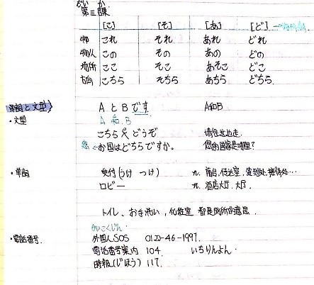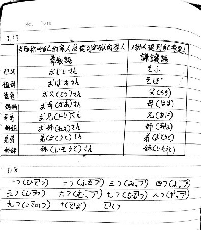 学生们的日语学习笔记各具特色,有的笔记简明扼要,结构清晰,学生还用不同颜色的笔标注了重点;有的笔记用表格形式记录,一目了然,便于查看;还有的笔记注明了日期,并且再数量词上标注了划线式声调,便于正确发音,非常好!