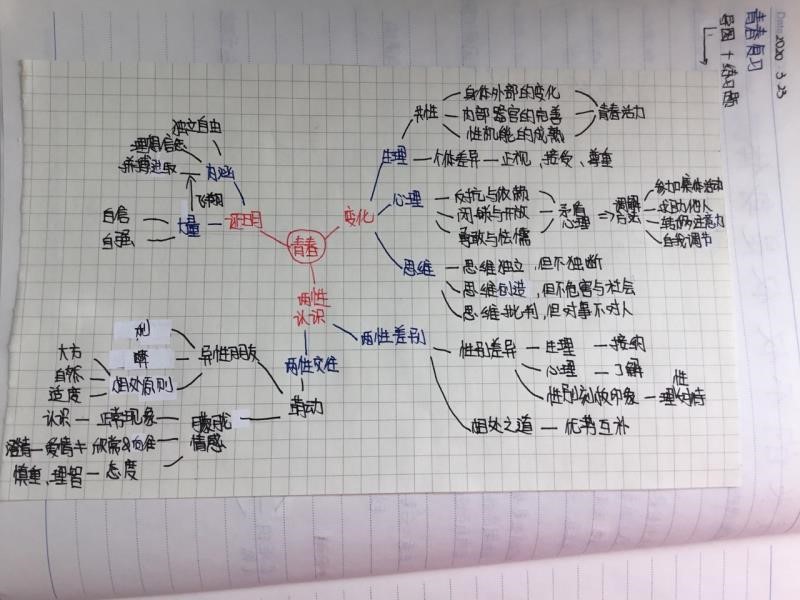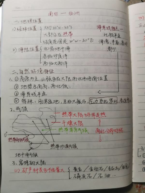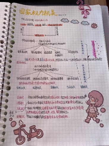 政治笔记字迹工整,内容记录完整详细,学生们不仅用不同颜色的笔标准重点知识,还在课余时间用心点缀,由此看出学生们善于在学习中创造乐趣。赏心悦目。