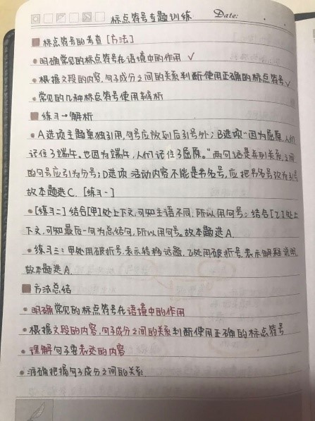 学生们用不同颜色的笔巧做标注,使笔记层次分明、清晰明了,考点、技巧、备注一目了然。