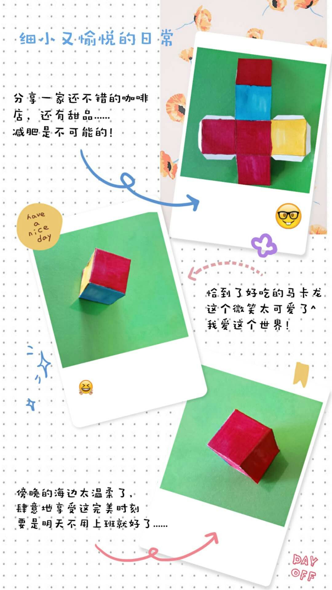 五年级围绕数学的“图形与几何”领域,通过设计"立体图形的制作"、"长、正方体展开与折叠"等实践活动和"图形中的规律"等探究活动,使学生在看、摸、量、折、剪、粘、摆等实际操作中进一步探索长方体和正方体的特征,思维经历从三维空间到二维平面再到三维空间的过程,借助几何直观,发展空间观念和空间推理能力,积累研究立体图形的经验与方法。