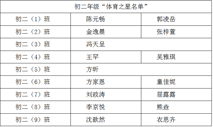 初二年级为发挥榜样效应,通过学生自荐、公平推选、每班师生共同评选出2名“体育之星”。通过表彰先进、树立典型,激发出学生昂扬向上的体育锻炼热情。