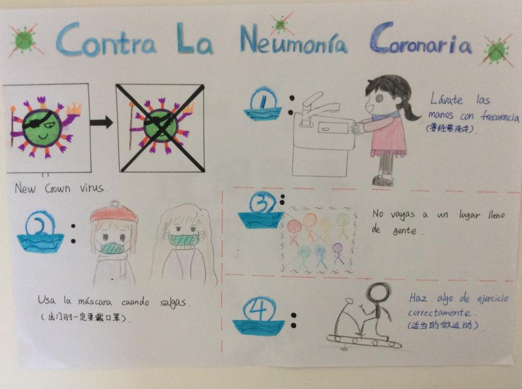 此外,针对当前整个欧洲新冠疫情,特别是西班牙的严峻形势,初一学生还贴心地为西语外教Inma录制抗疫小贴士。他们课上制作手抄报和文稿,后期自拍成视频,关怀外教的同时,呼吁大家做好自我防护!