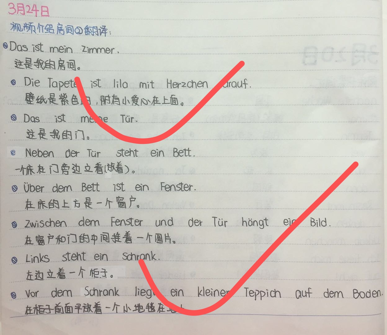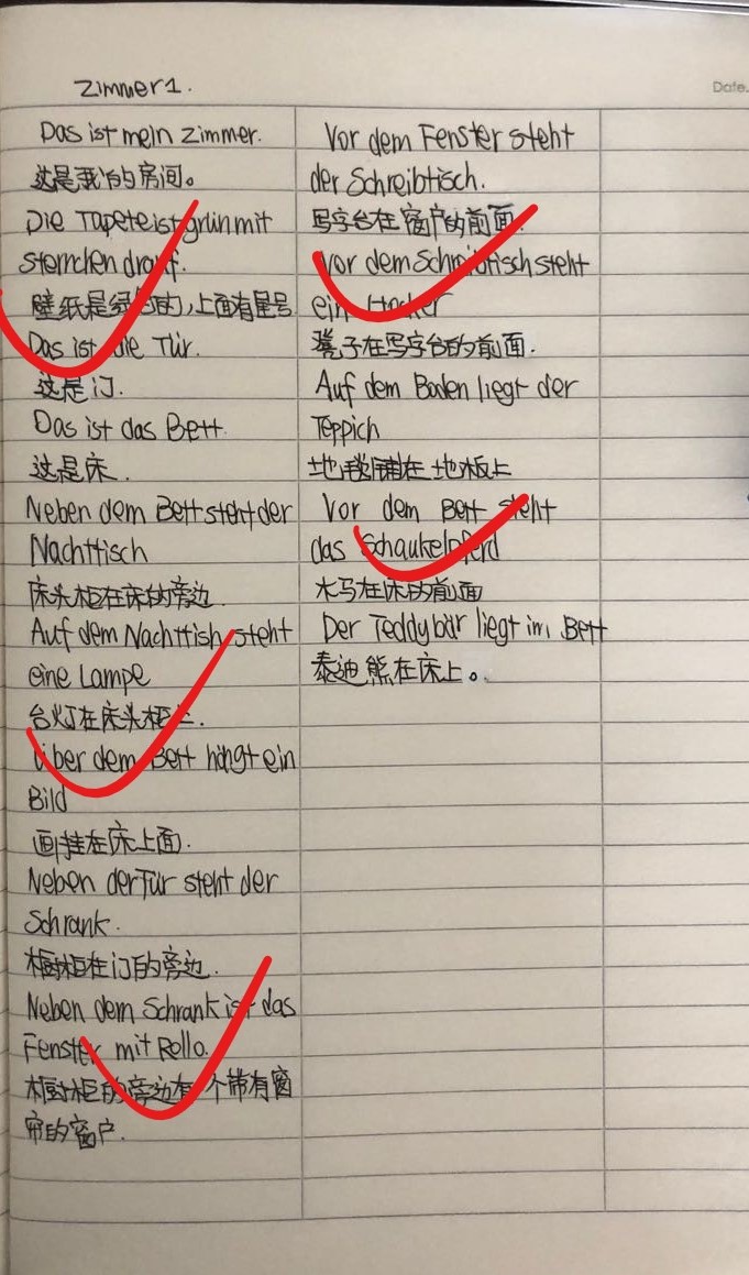 此外,德语组还开展了我的房间主题练习,通过写作和翻译的练习,巩固学生对该主题词汇的掌握,强化主题词汇及第三格等基础语法。