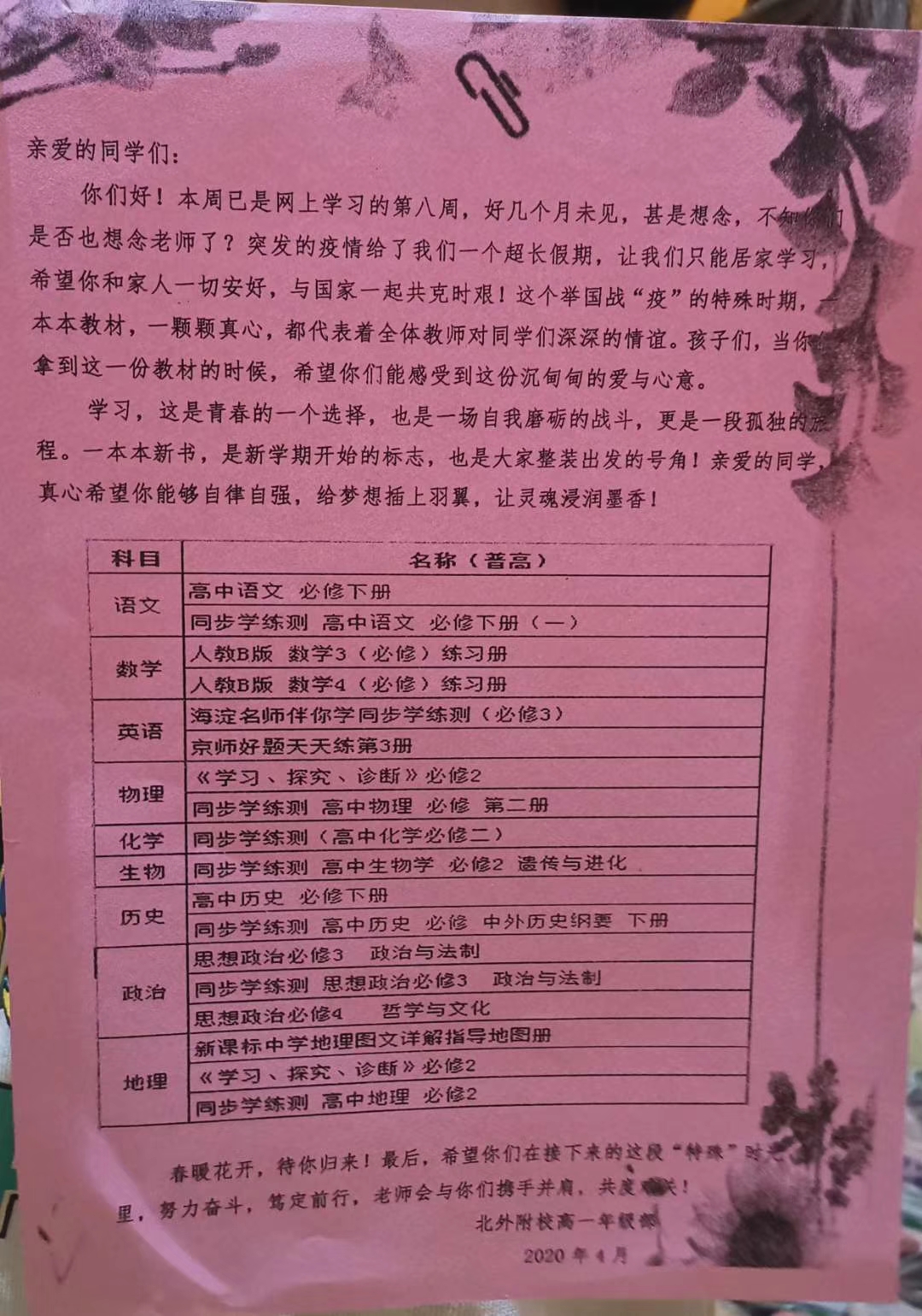 在这个举国战“疫”的特殊时期,一本本教材,一颗颗真心,都代表着全体教师对同学们深深的师生情谊。隔离病毒不隔离爱,当家长们接过精心打包好的书籍时,里面还附有一张粉红色的书单。这不是一张普通的书单,它饱含着老师们对同学们的思念、叮嘱与期望。一本本新书,是新学期开始的标志,也是学生整装出发的号角!希望同学们在居家学习的这段“特殊”时光里,努力奋斗,笃定前行,携手并肩,共度难关!