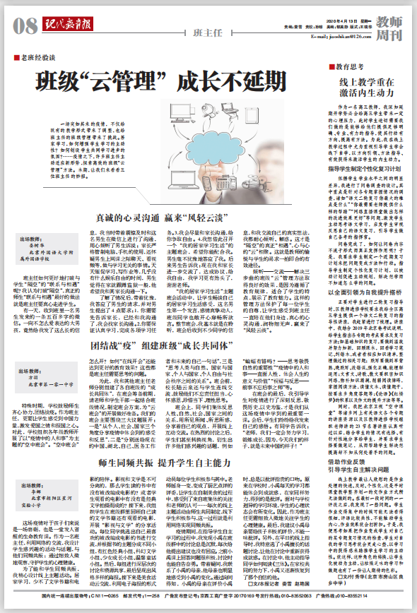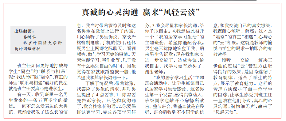 4月13日,《现代教育报》刊发了我校高中语文教师娄树华的班主任随笔《真诚的心灵沟通 赢来“风轻云淡”》。