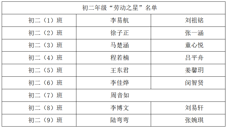 初二年级为发挥榜样效应,通过学生自荐、公平推选,每班师生共同评选出2名“劳动之星”。通过表彰先进、树立典型,激发出学生昂扬向上的劳动热情。