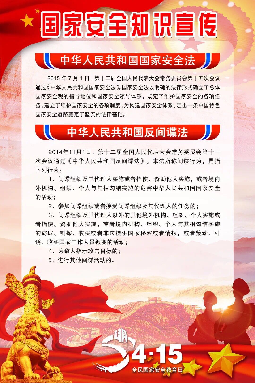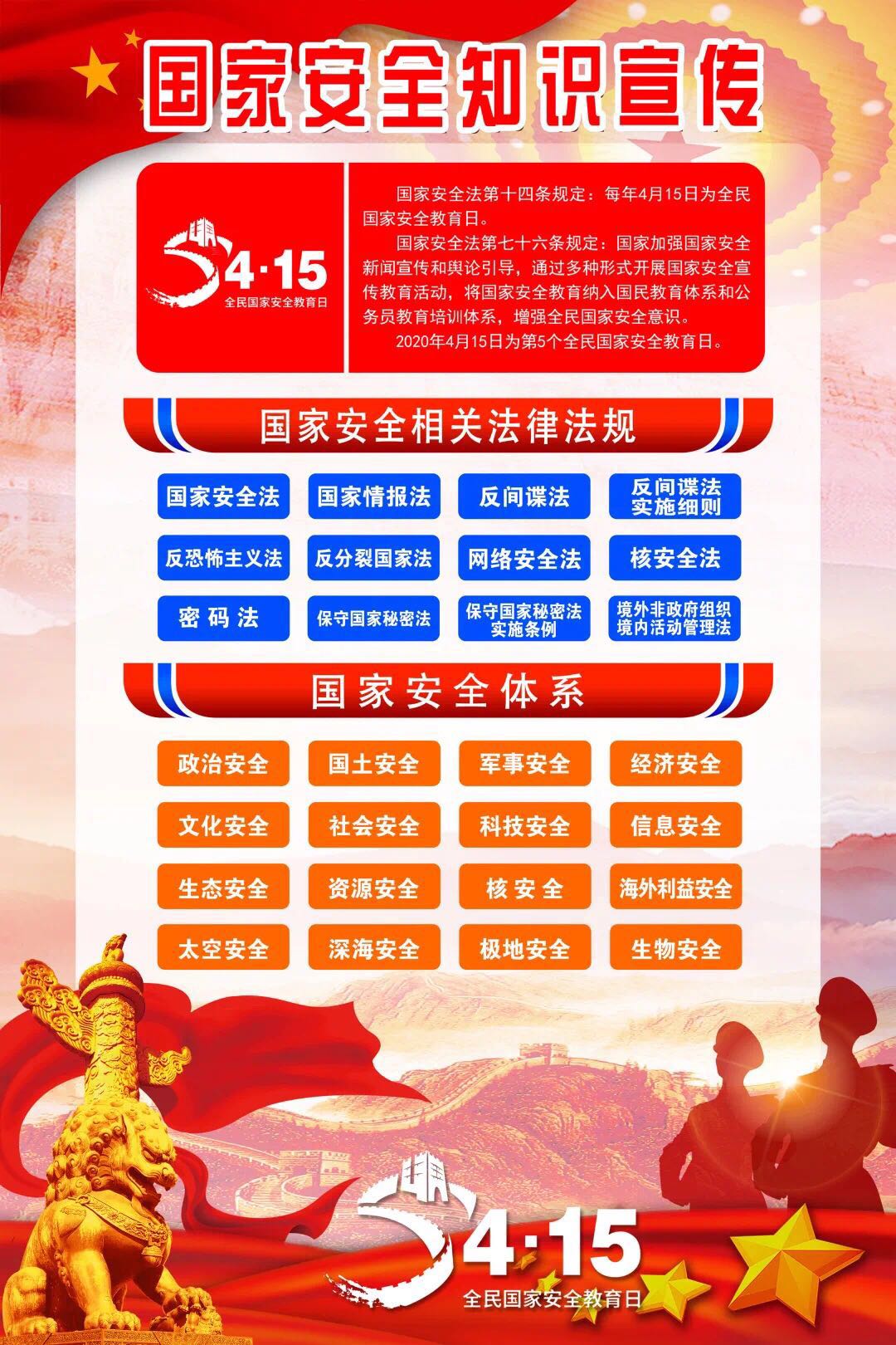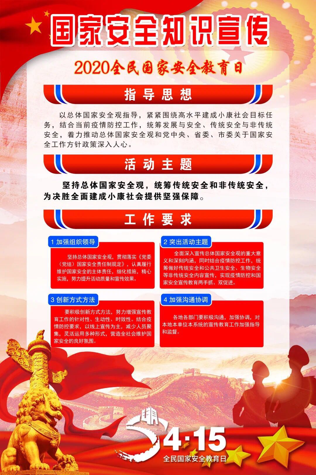 2015年7月1日全国人大常委会通过的《国家安全法》将每年4月15日定为全民国家安全教育日,2020年4月15日是我国第五个全民国家安全教育日。本次活动主题:坚持总体国家安全观,统筹传统安全和非传统安全,为决胜全面建成小康社会提供坚强保障。