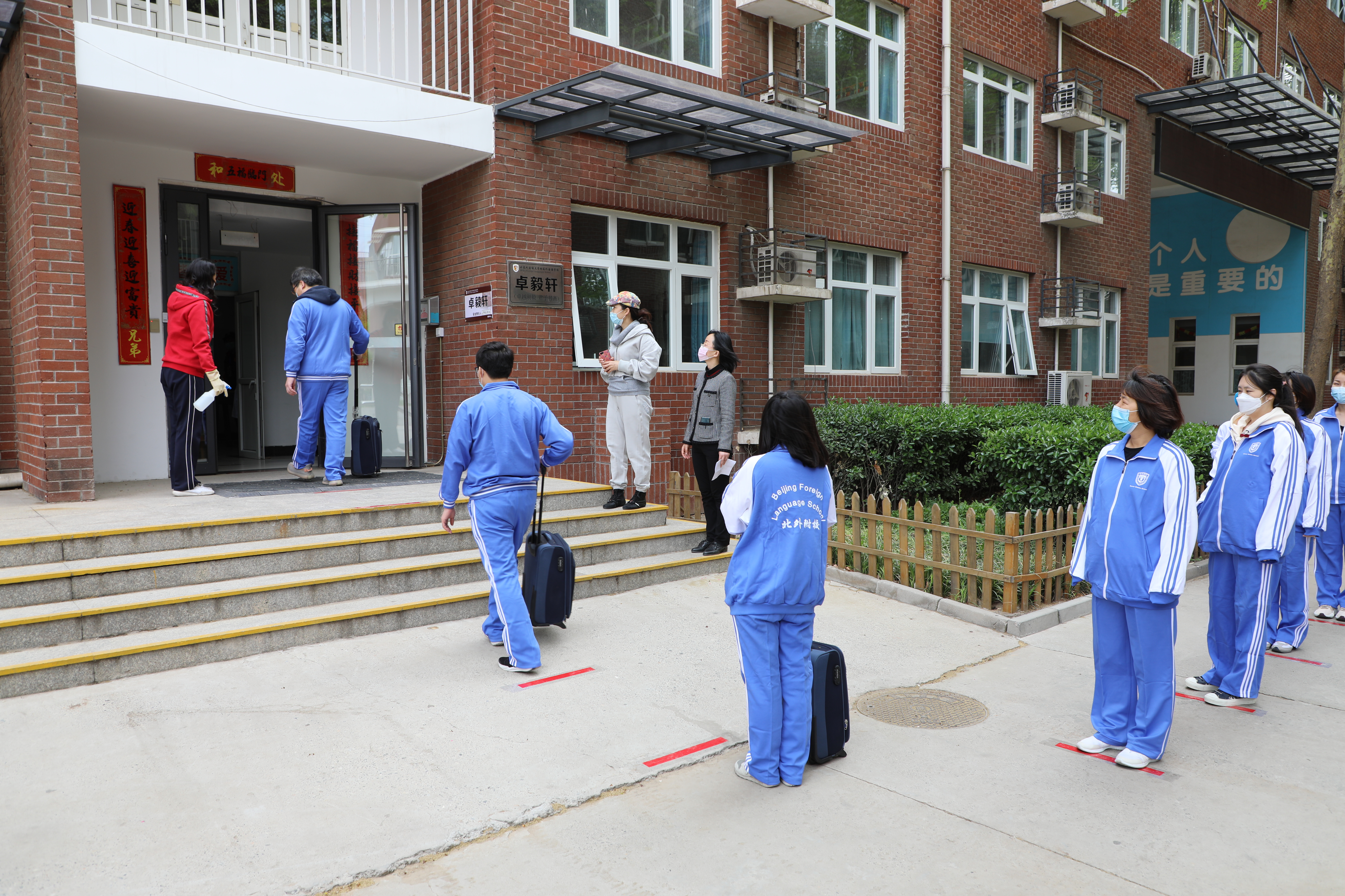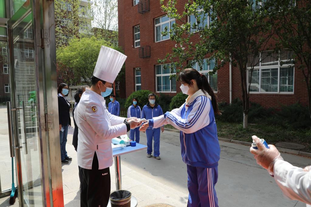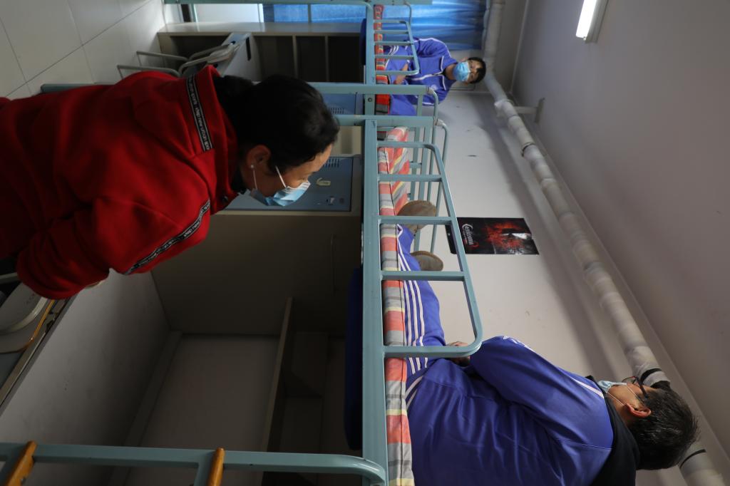 住宿“学生”按指定路线,保持间距进入宿舍区。每间寝室限住4人,相邻两床最大程度保证学生间隔。早晨由生活指导老师进行日常测温,有序排队洗漱。学生离开后,由专职消毒人员对宿舍进行全面消毒。