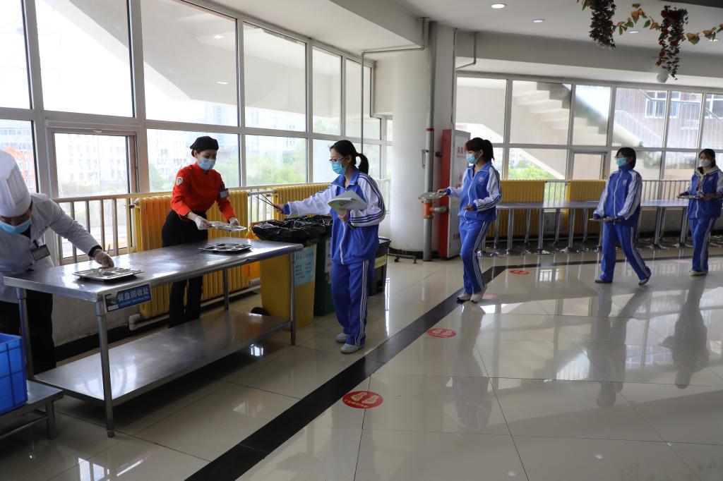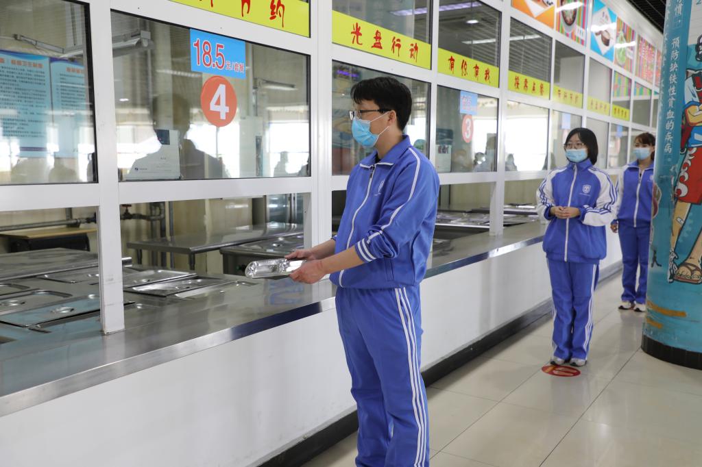 按照错时分散就餐方案,“学生”在指定的就餐时间,佩戴口罩、有序间隔排队入场,洗手消毒,在规定窗口排队领餐,在规定座位用餐。保持距离,不得聚集。饭后工作人员对餐厅、学生餐具进行集中消毒。