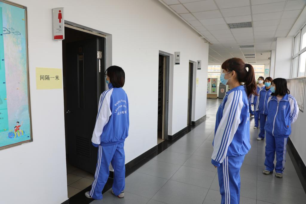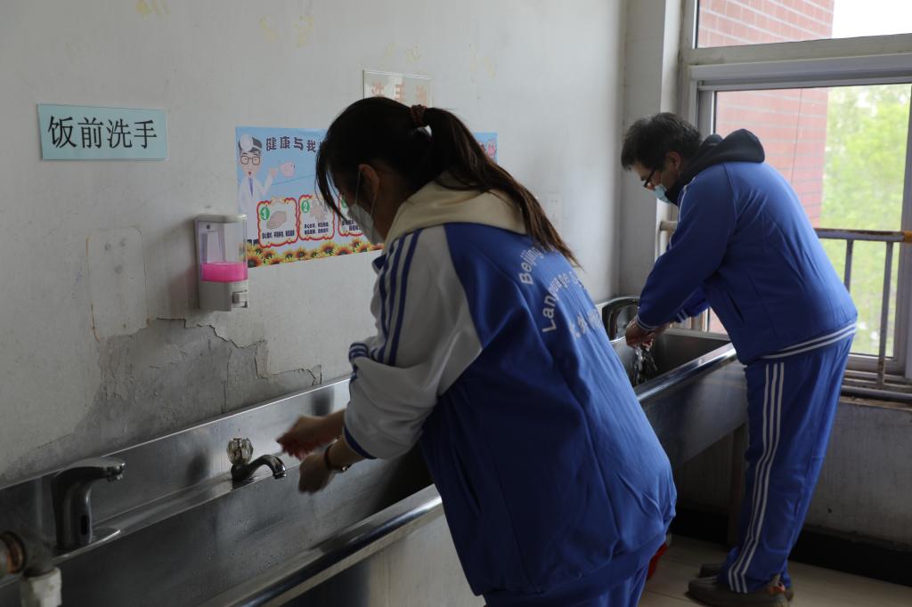 “学生”在测量体温后依次走进教室。教室内所有“学生”单人单桌,间隔1米。课间时段,任课教师组织“学生”有序上厕所,并采用7步洗手法洗手。同时,每天做好日常开窗通风、换水记录等工作。