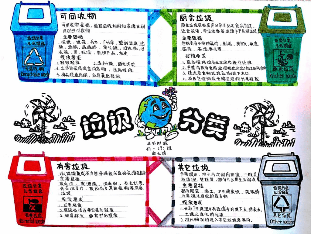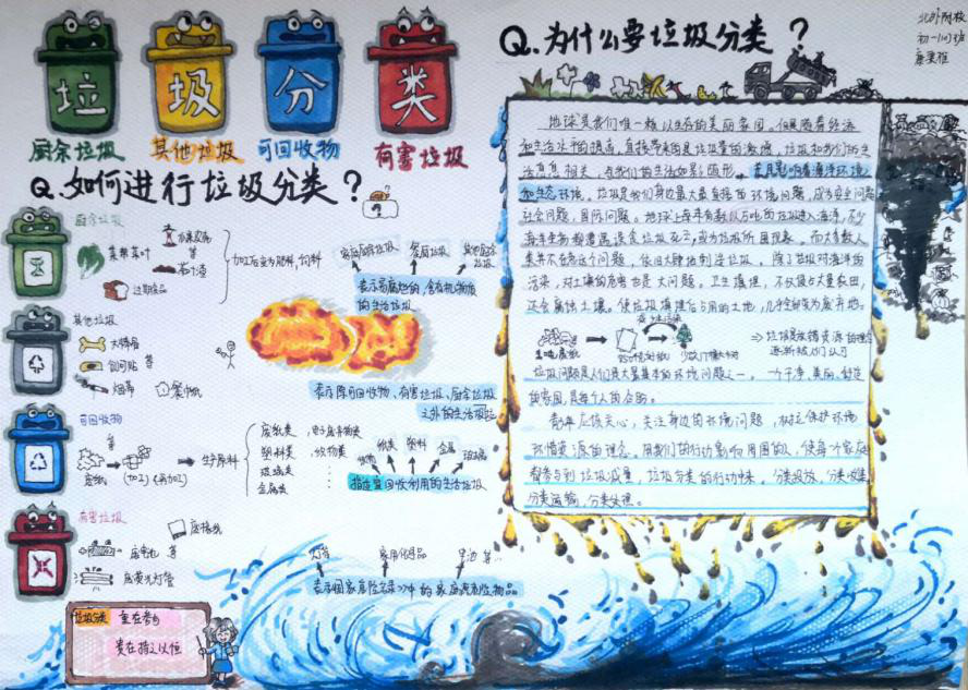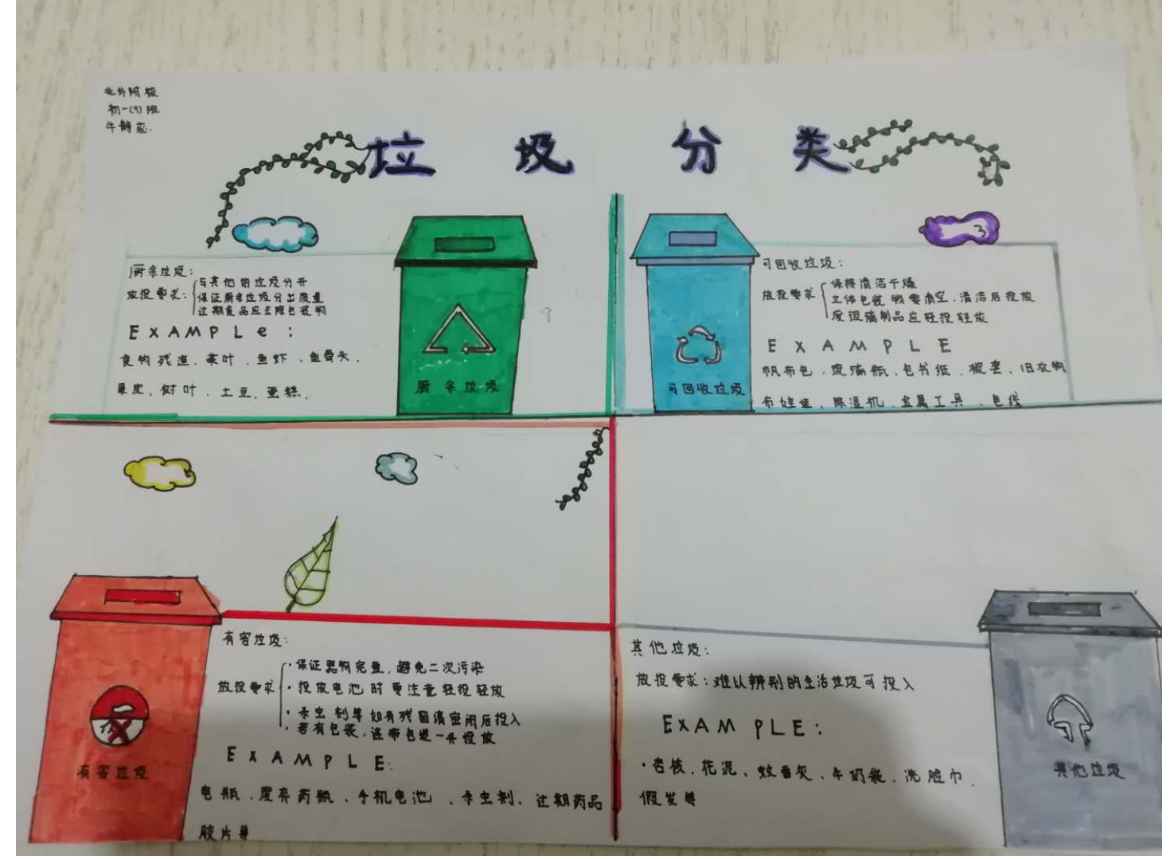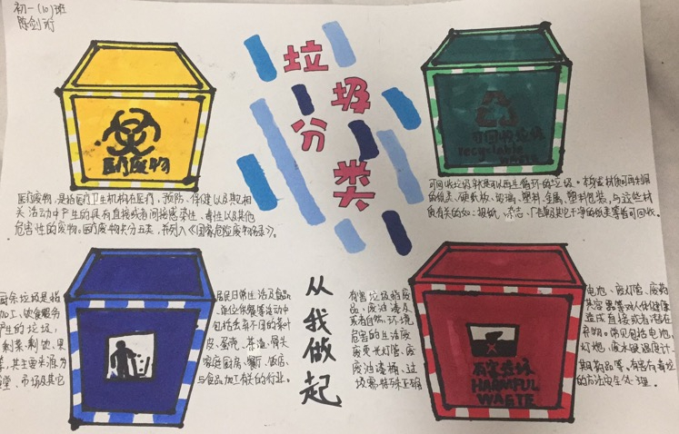 在这次垃圾分类的主题活动中,我认真制作了主题手抄报。平时我非常注重垃圾分类并严格执行,也会在公共场合捡拾垃圾。我倡导家人少开车绿色出行,并经常参加植树节活动和野生动物保护站的义务工作。在此我想呼吁大家一起加入环保的行列,保护我们的地球。