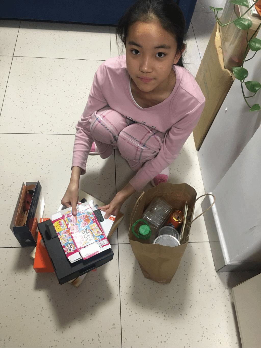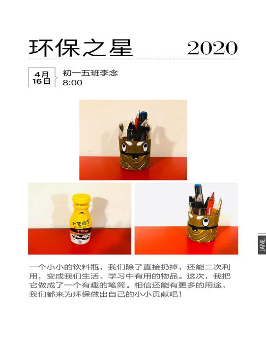 在平时生活中,看到身边的垃圾我都会随时捡起来放到垃圾箱。在我的建议下,家人购物尽量不使用塑料袋。做饭时的淘米水也进行再利用。我自己也会做一些回收利用的小制作。在以后的生活中我也随时把环保放在心上。