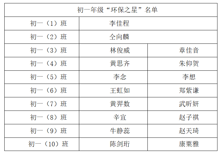 初一年级为发挥榜样效应,通过学生自荐、公平推选,每班师生共同评选出2名“环保之星”。通过表彰先进、树立典型,激发出学生昂扬向上的环保热情。