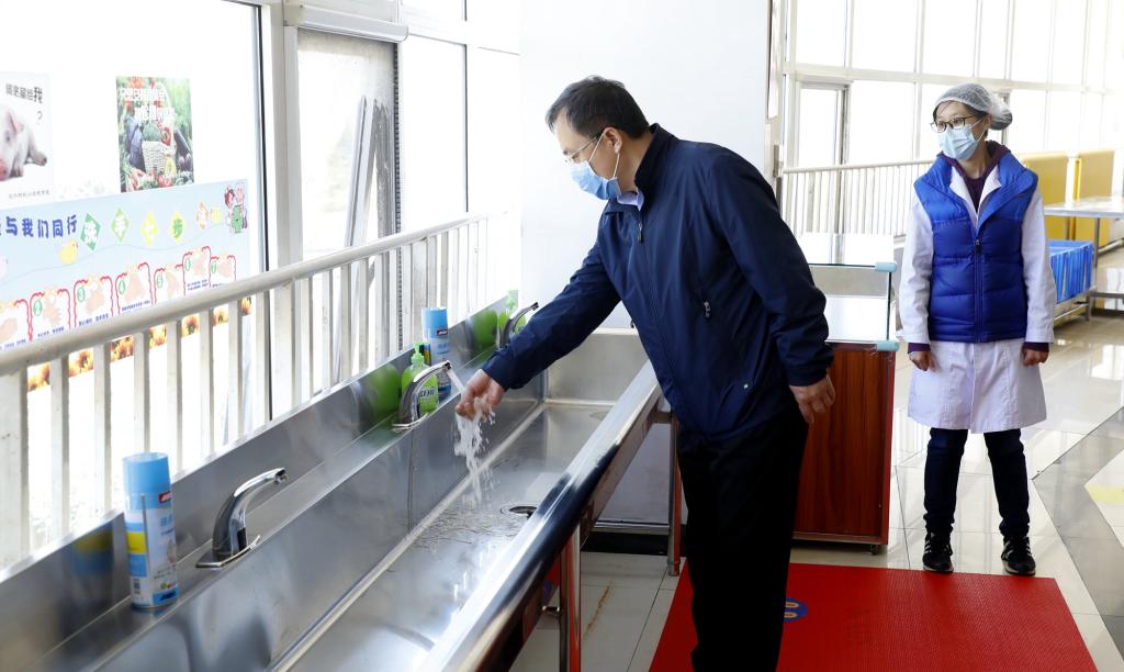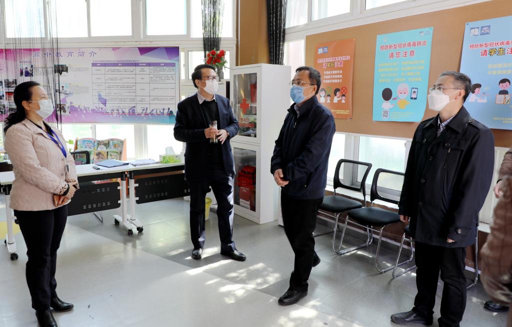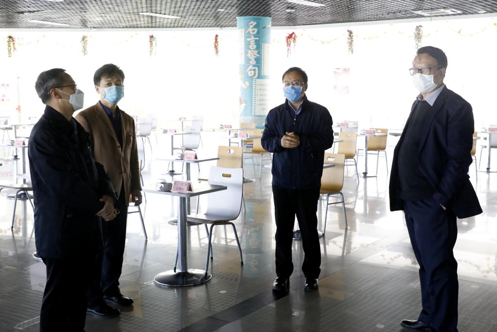 贾德忠一行先后来到运动场、南门、高三教学区、宿管中心、医务室(隔离室)、食堂等区域检查,林卫民在现场向检查组全面汇报了高三试开学工作的整体安排及各项工作预案。
