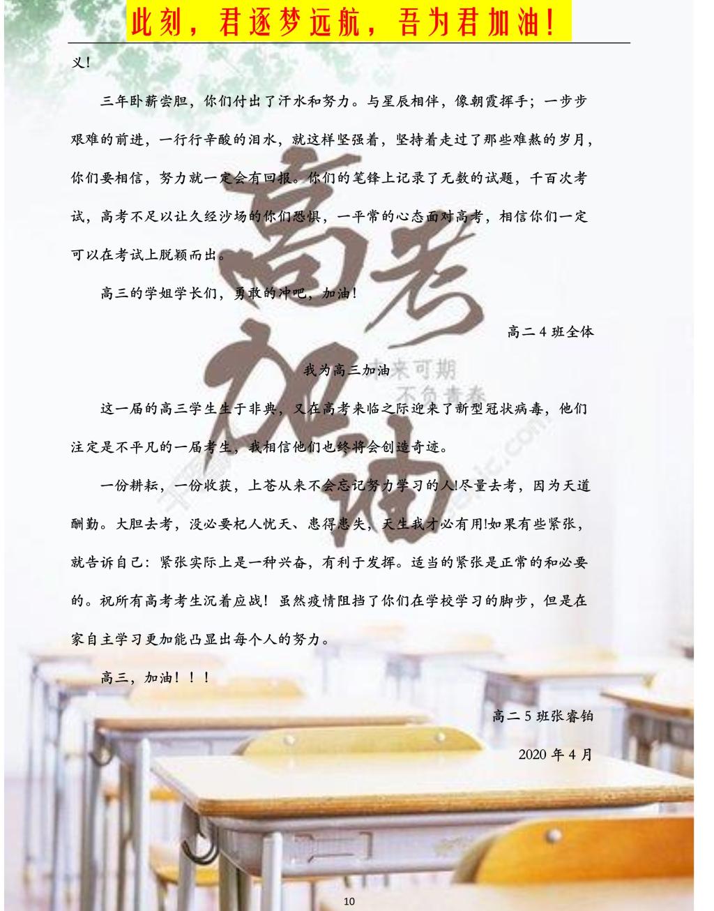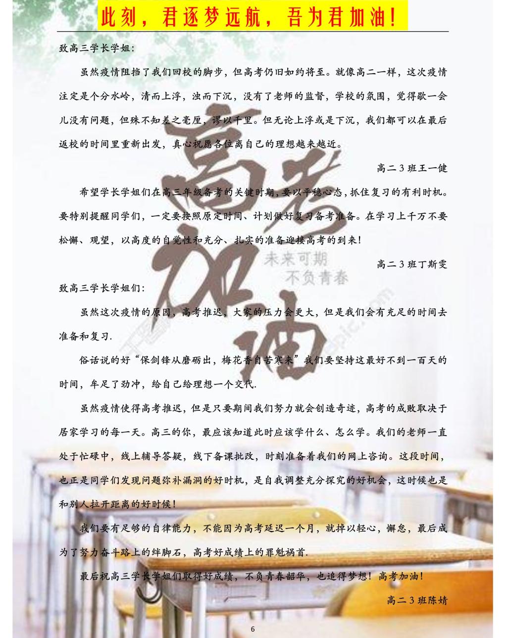 4月27日,高三学子正式返校上课,继续备战高考。高二年级师生为2017级学子送上浓浓祝福:希望你们承载着青春梦、附校梦、中国梦,扬帆起航;祝愿你们在2020高考中脚踏实地、努力拼搏,再攀高峰、续写辉煌。