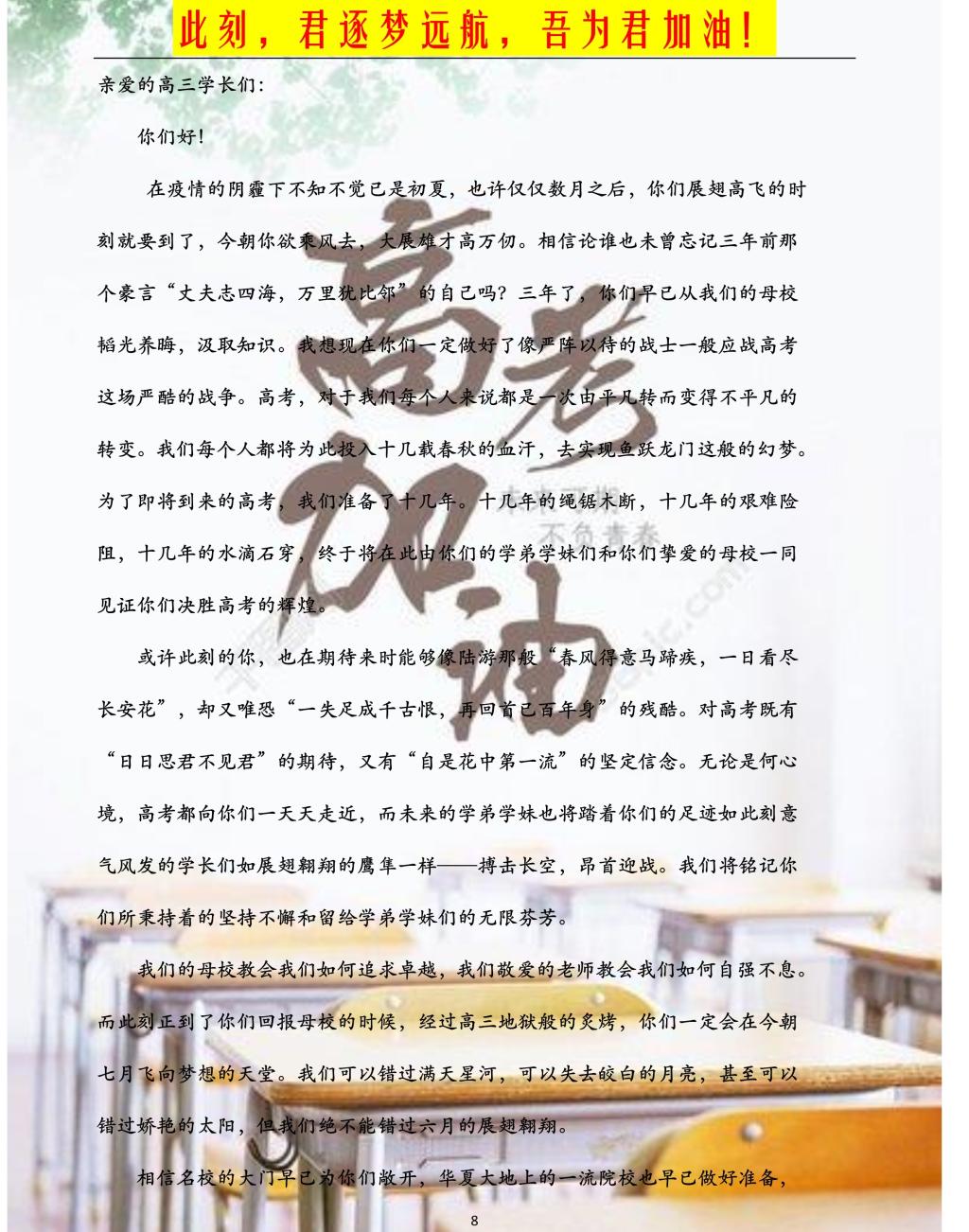 青年一代逢时节闪亮登场,附校学子乘东风金榜题名。蟾宫折桂,践行理想。树立必胜的信心,用奋斗和拼搏绽放青春梦想,创造属于自己的辉煌,书写附校的新篇章。