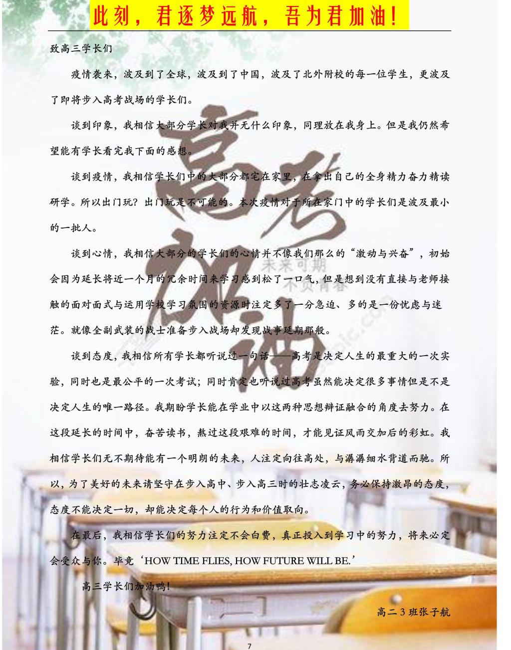 希望你们在梦想远航的七月,把“成功”标注在高扬的风帆;在高扬风帆的季节,用沉稳与踏实书写青春的注解;在注解青春的时刻,坚守梦想、目光坚毅、笃定远航——为学子梦,为附校梦,为中国梦扬帆远航!