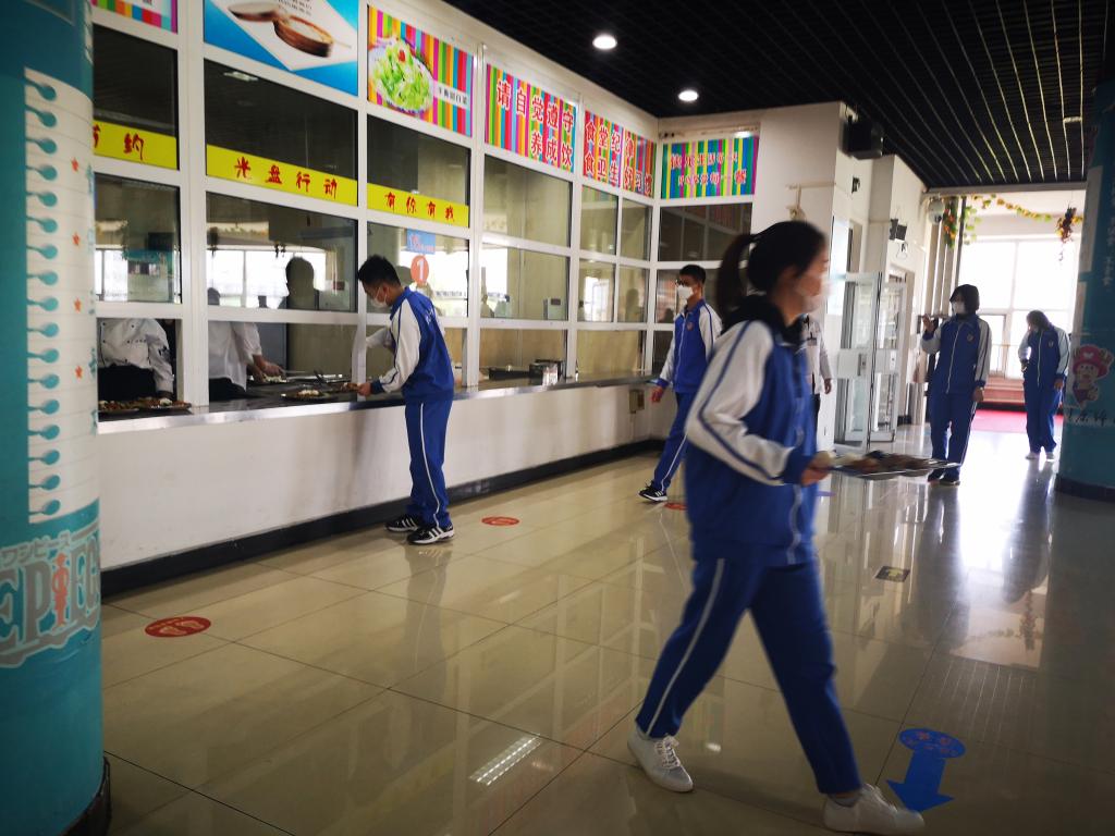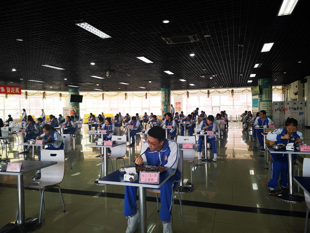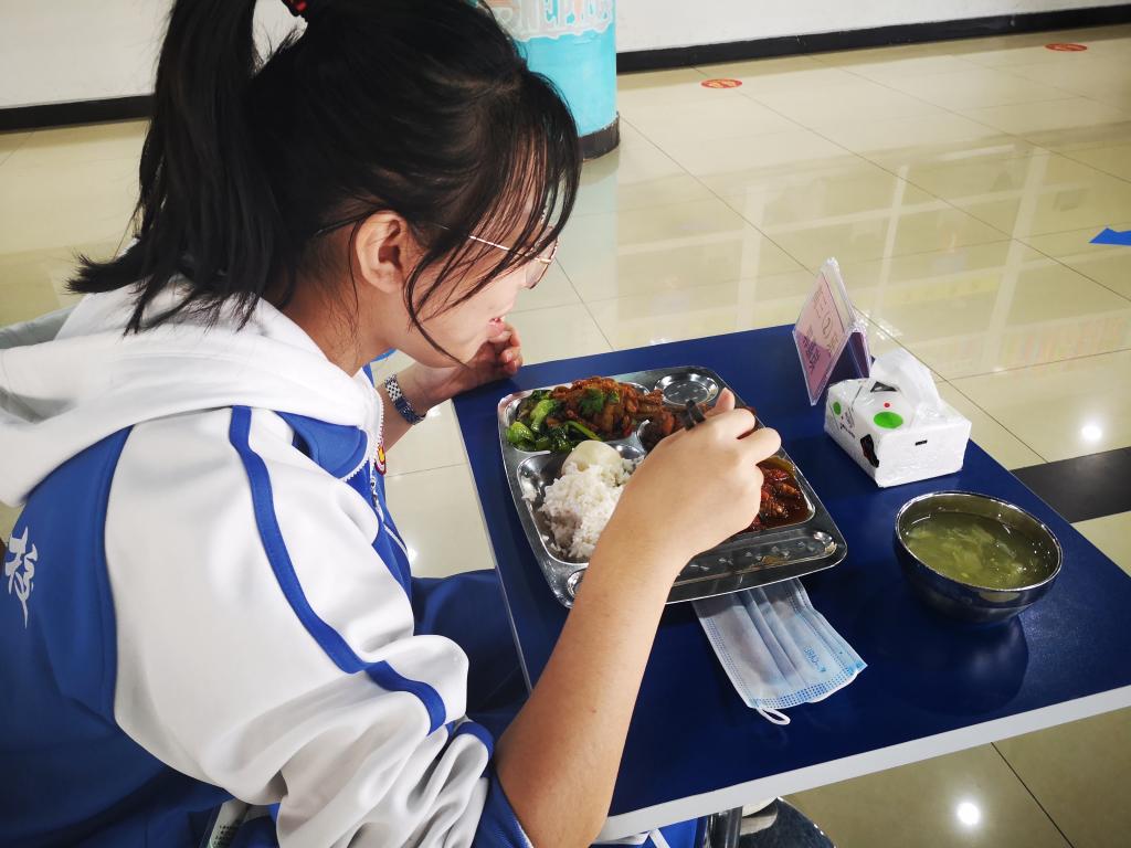 同学们按照错时分散就餐方案,学生在指定的就餐时间,佩戴口罩、有序间隔排队入场,洗手消毒,在规定窗口排队领餐,在规定座位用餐。保持距离,不聚集。