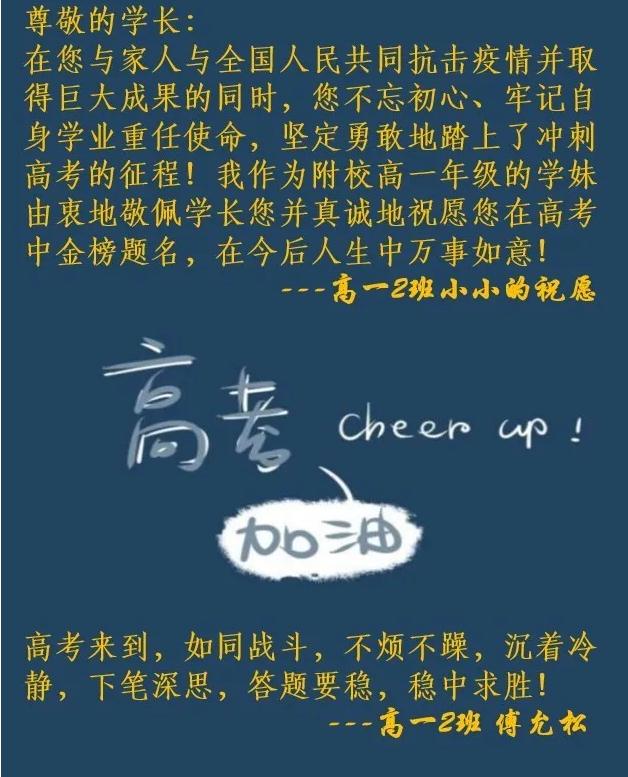 除了严格疫情防控,我校给每个高三学生准备了一个小惊喜,每位高一高二的学生、老师都为他们送上了暖暖的祝福,让同学们感受到不是一个人在战斗,为他们加油打气。