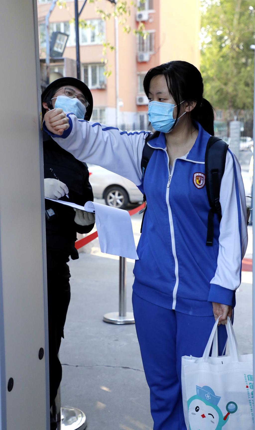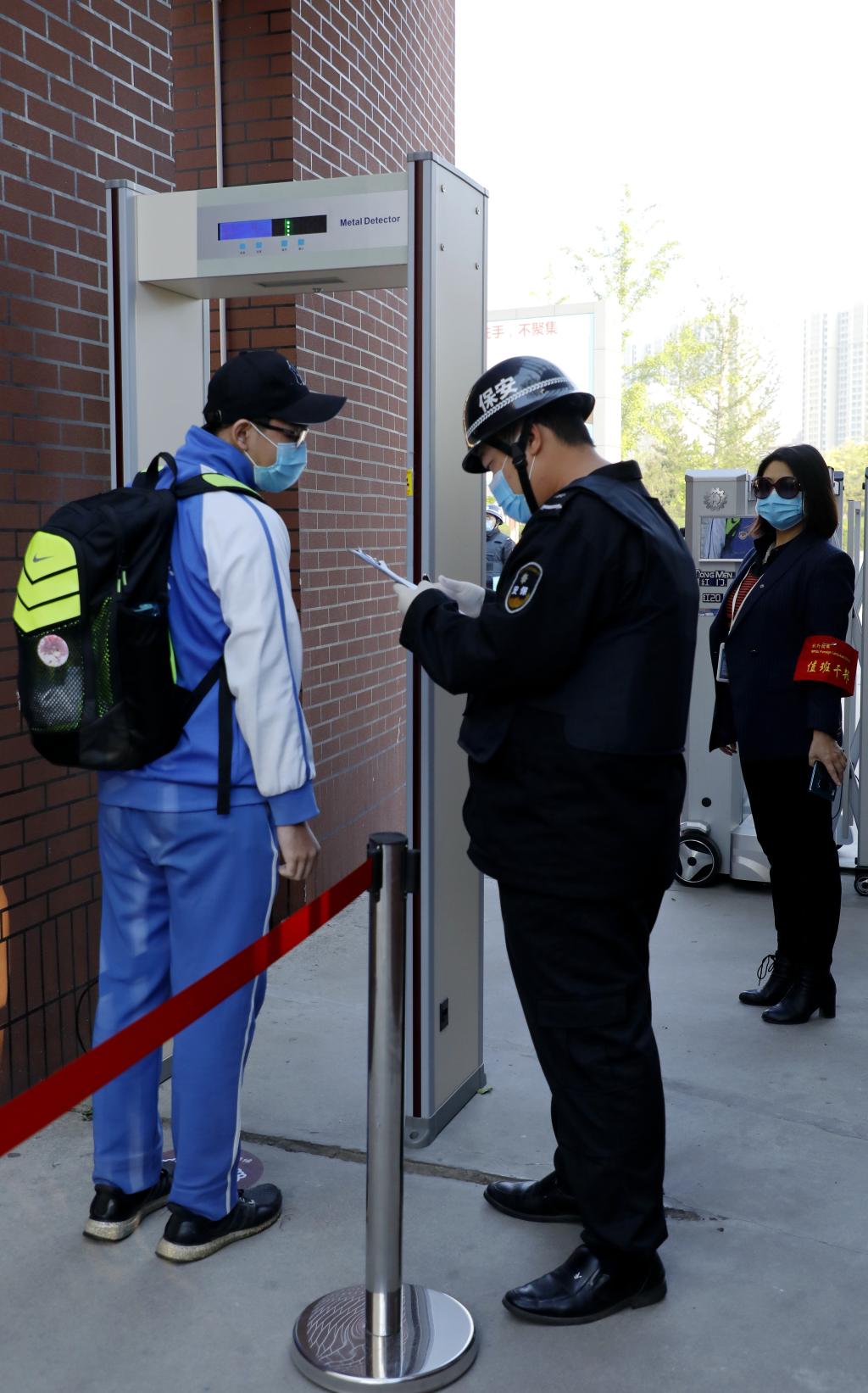 在工作人员的引导下,高三学生在学校门口监测点,依次通过出示健康二维码验证、测温等环节确认体温正常,进入学校。同学们入校后实行分流,保持间距1米,按照指定通道有序进校。
