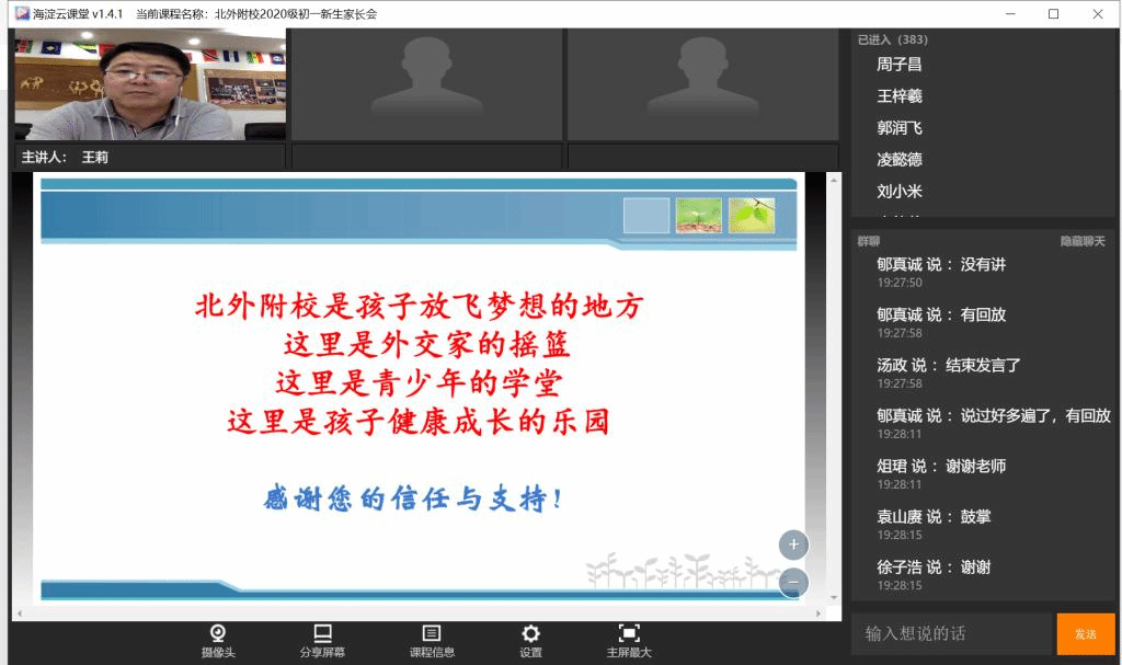 2020年7月8日下午,我校初中部召开线上2020级初一年级家长会。我校副校长、初中执行校长杨磊,初中教导处主任王莉,初一年级部主任朱强和初一年级全体学生家长通过视频会议软件参会。会议由王莉主持。