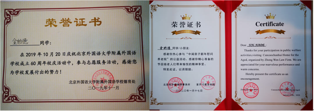 学校运动场馆设施齐全、经常组织各种社团活动、开展社会实践课程,挖掘孩子潜能、培养孩子全方位发展,金纳德在北外附校上学习期间先后学习了围棋、跆拳道、葫芦丝、竹笛、钢琴、高尔夫球等课程,陶冶了情操、强健了体魄、启发了思维,这对孩子一生乐观健康向上的生活起到了非常积极重要作用。在参与以上活动的过程中,金纳德的性格越来越开朗阳光,社会交际能力也日益增强,完全能够迅速适应环境变化,与同学、老师、教职员工关系都相处的极其和谐融洽。特别是在北外附校60周年校庆之际,金纳德主动报名担任志愿者,在活动中深刻感受到集体荣誉感和责任感,最后圆满完成了志愿者工作任务并被授予荣誉证书。