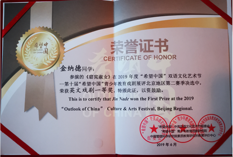 在学校老师的指导下,金纳德在全国英语阅读之星比赛中获得北京赛区三等奖、全国双语文化节中学生比赛北京赛区一等奖的好成绩。