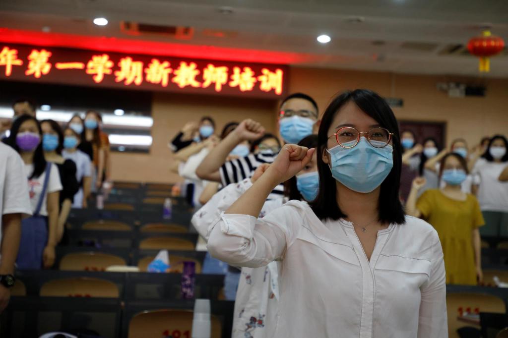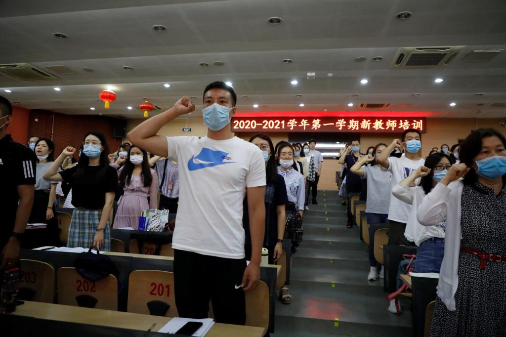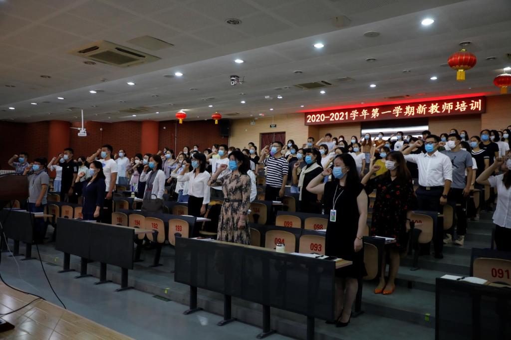 李琳带领全体新入职教师进行宣誓,“心有家国,德才兼修;心有学生,以爱相陪。兼容并蓄,固文明传承之本;博学笃行,育祖国未来之才”。誓言铮铮,意气风发,道出了老师们的教育情怀。