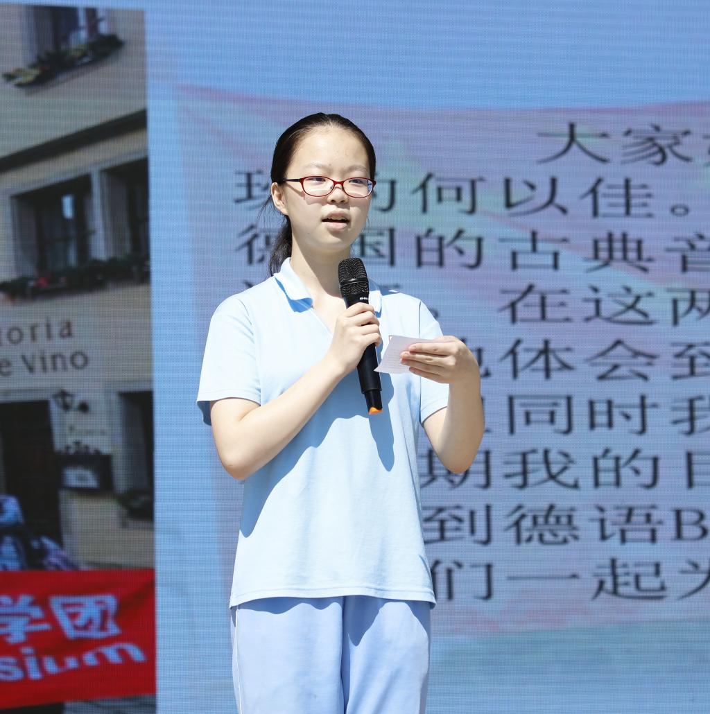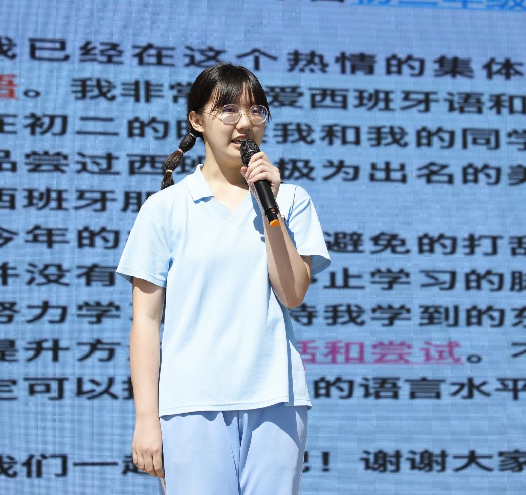 其后,学生代表分别用汉语、英语、德语、西班牙语、法语以及日语畅谈自己的学习心得以及新学期的目标与计划。展现了我校以“打造双复型外语特色学校”为办学目标,积极培养“外语特长、文理兼优、素质全面的复合型国际化英才的风采。