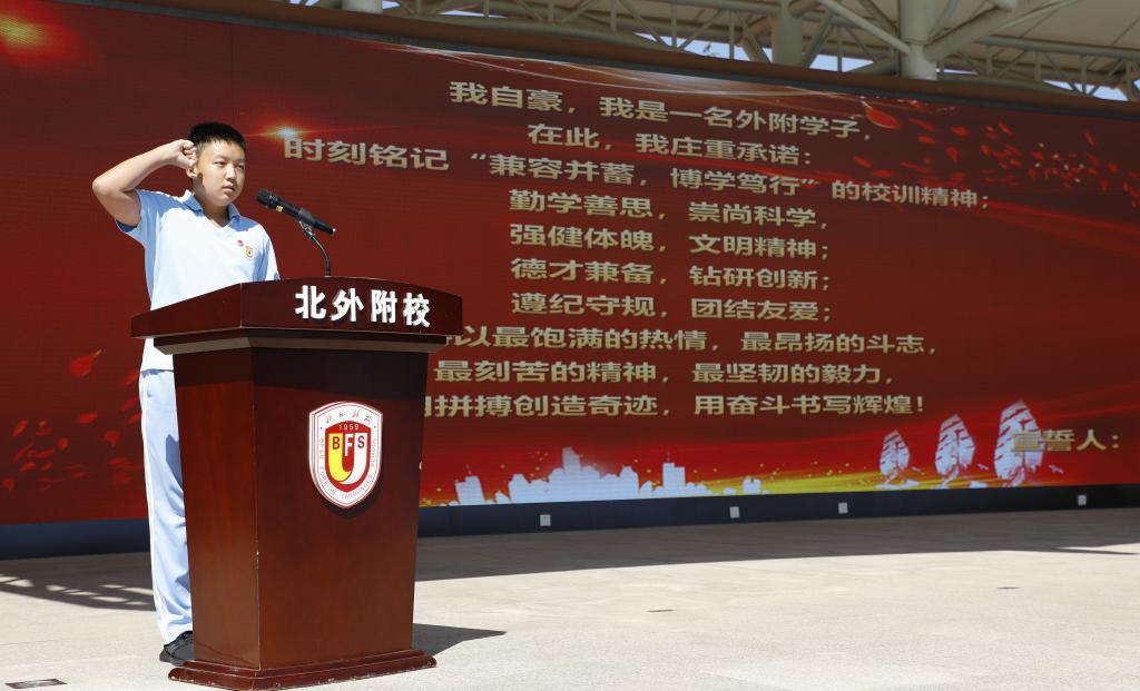 活动最后,林卫民向学生代表骆子墨同学颁发新学期“任务令”,骆子墨上台开启任务令,并带领全体北外附校初中生宣誓,作为北外附校的学生,应当时刻铭记“兼容并蓄,博学笃行”的校训精神。